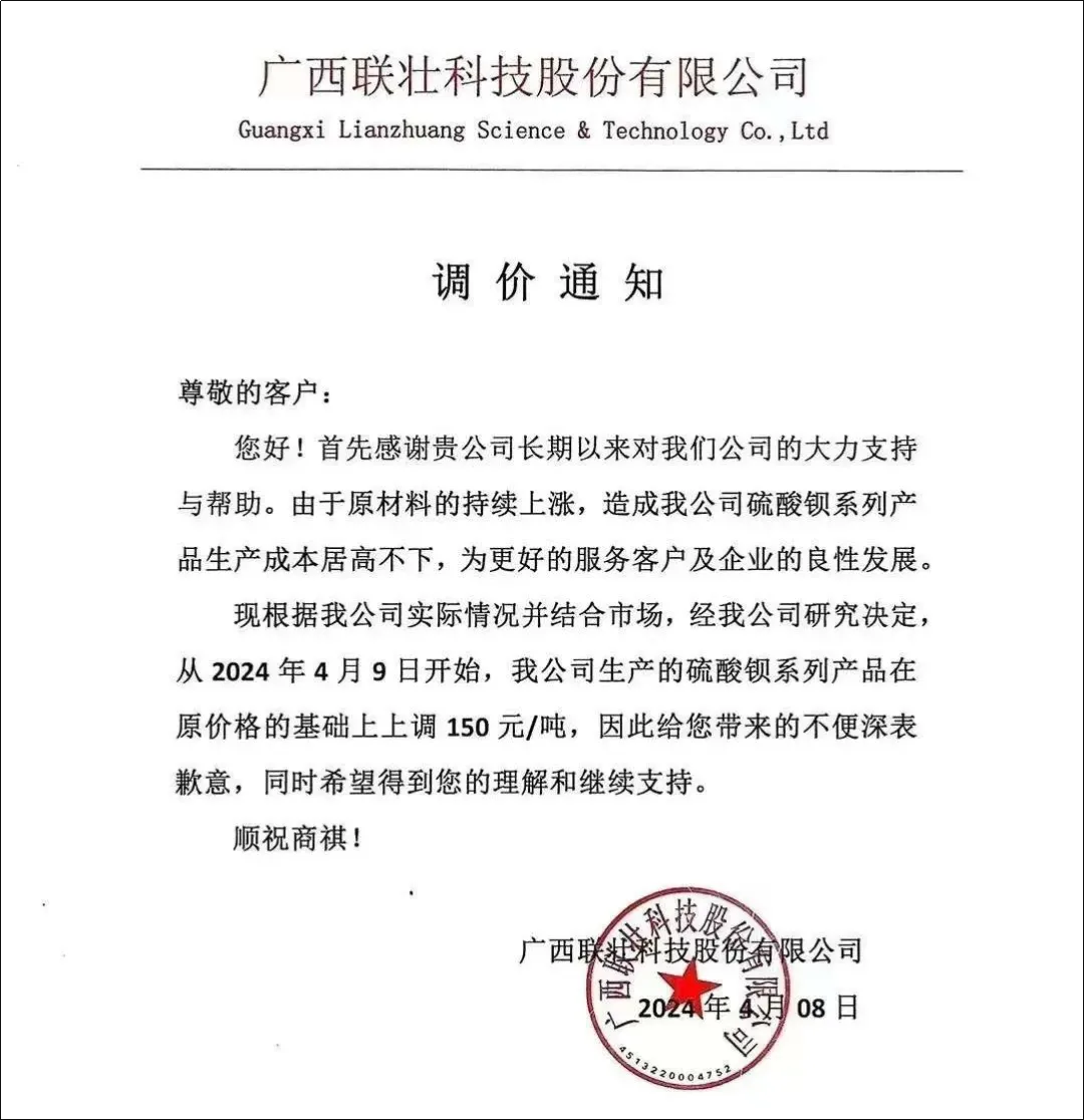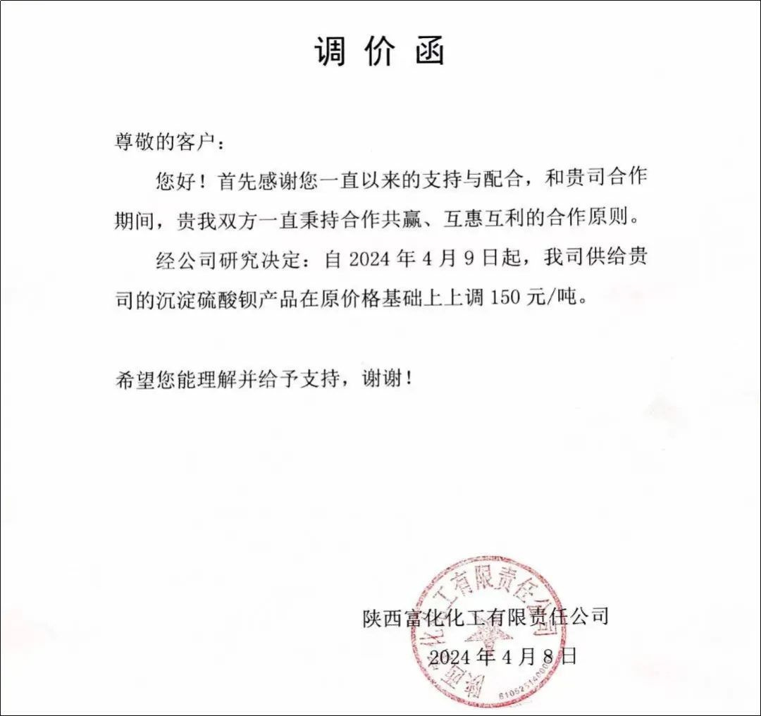 山西富化化工表示,沉淀硫酸钡在原价基础上上涨150元/吨。