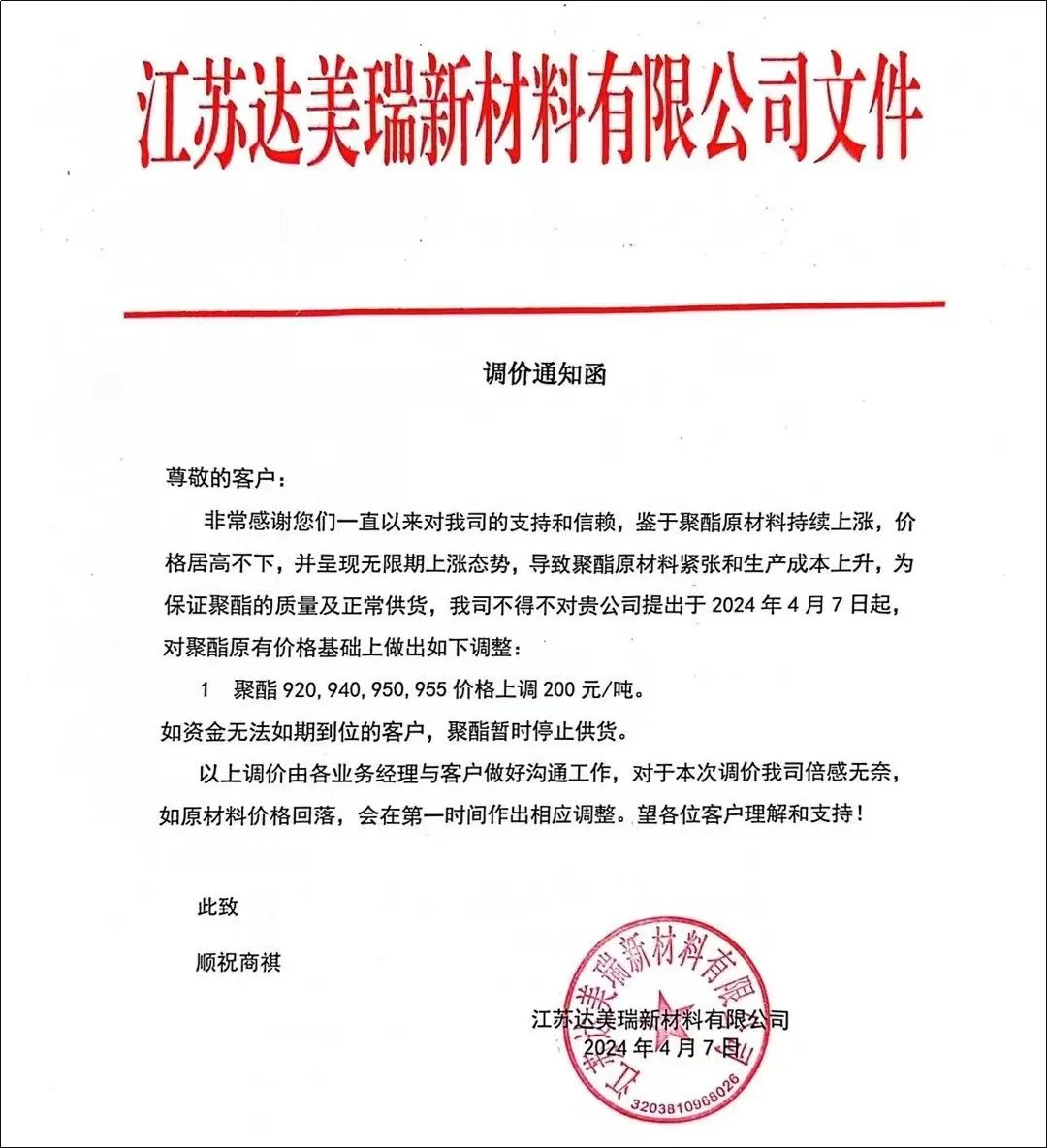 江苏达美瑞新材料表示,聚酯920、940、950、955价格上调200元/吨。