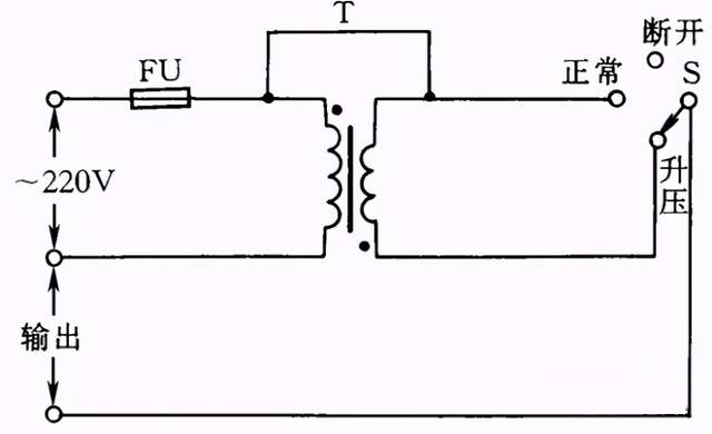 一般的单相自耦调压器调压范围是0~250V。但有时需要高于250V的可调电压,那么按图34接线,可以得到0~406V连续可调的输出电压。当S打在“1”挡位置时,输出电压为0~250V;将S打在“2”挡位置时,输出电压为220~406V。