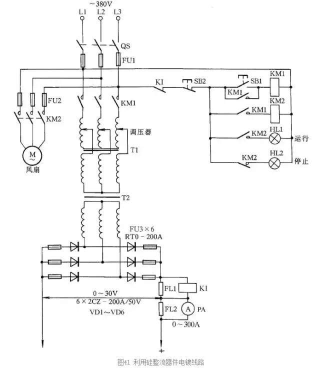 在电镀过程中,常常利用硅整流器件的调压电路进行工作,其工作原理如图41所示。当需进行工作时,按下按钮SB1,接触器KM1 线圈通电,主回路中触点闭合,线路输出直流电压。与此同时,KM2 也得电动作,接通电扇,对硅整流器件以及调压器吹冷风降温。线路中KI 为过流继电器。