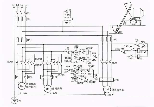 此时操作人员按下下降按钮2SBR时,卷扬系统带动料斗下降,待下降到其料口与地面平齐时,挡铁碰撞行程开关3SQ,使2KMR接触器断电释放,自动停止下降,为下次上料做好准备,这时搅拌机料已备好,操作人员再按下3SB1,3KM接触器得电吸合,使供水抽水泵电动机3M运转,向搅拌机内供水,与此同时,时间继电器KT得电工作,待供水与原料成比例后(供水时间由KT时间继电器调整确定,根据原料与水的配比确定),KT动作延时结束,从而使3KM自动释放,供水停止。