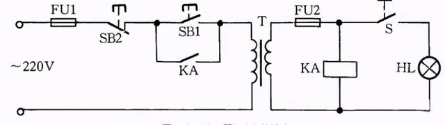 工作原理:闭合S后,按下按钮SB1,变压器得电输出36V低电压,使得继电器或交流接触器KA吸合。放松按钮SB1后,KA自锁触点使KA保持吸合,继续给变压器接通电源。如果变压器次级发生短路故障,继电器线圈电压为零,此时KA便失电释放,将变压器电源断开,保护变压器不被破坏。