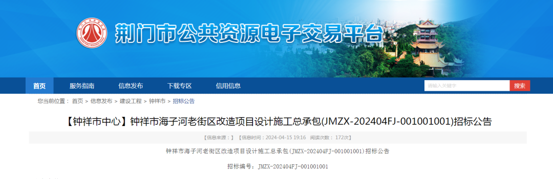 钟祥市海子河老街区改造项目已由钟祥市行政审批局以湖北省固定资产投资项目备案证(登记备案项目代码:2404-420881-04-01-799630)批准建设,项目业主为钟祥新驰建设工程有限公司,建设资金来源为自筹资金。招标人为钟祥新驰建设工程有限公司,招标代理机构为湖北宏信致远工程咨询有限公司。项目已具备招标条件,现对该项目采用工程总承包模式进行公开招标。