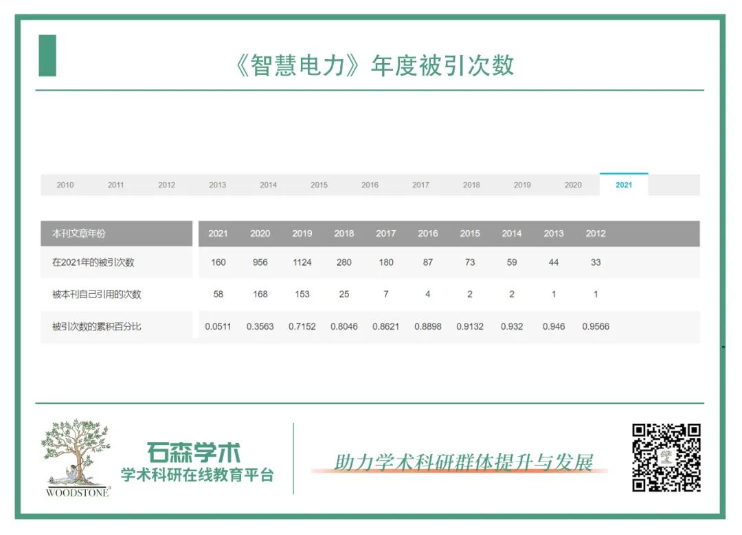 《智慧电力》属于北大核心期刊,期刊主要配电网、分布式电源等内容,但在电工技术研究领域有足够影响力,电动汽车、出点线路、电力系统的发文量也不少。2021年期刊中2019年被引次数最高,该期刊主要参考文献是“电力系统保护与控制”。