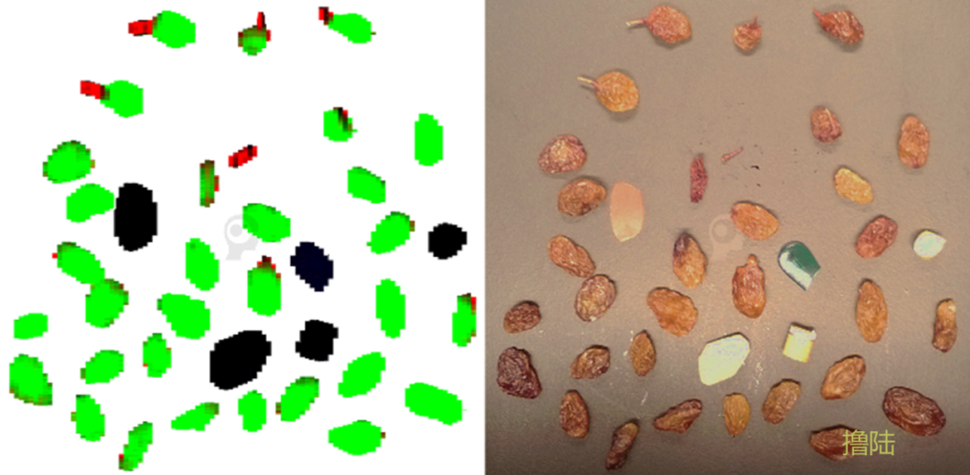 高光谱在葡萄干的生产中也有很多应用可能性。不但可以检测葡萄干的茎,但最重要的优点是也可以检测未知的杂质,如塑料、玻璃、纸板或香烟过滤嘴。这些未知的杂质可以以黑色显示。