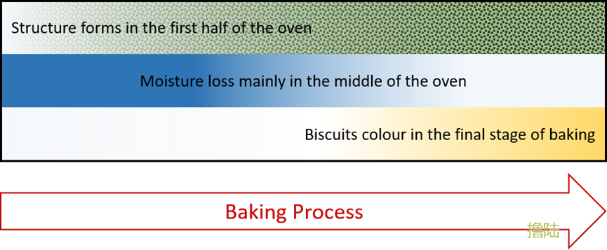 烘烤饼干经历了三个主要变化。在烤箱的前半部分,饼干的结构和质地逐渐形成。在水分减少的过程中,最后,在烤箱的最后三分之一处,饼干的表面开始变成棕色。