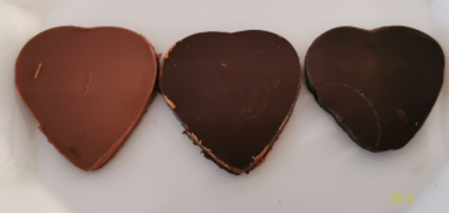 我们选择了三块含85%、70%可可和牛奶巧克力的巧克力。这种心形巧克力被用来创建定量分析的高光谱模型,以确定巧克力中的可可含量。