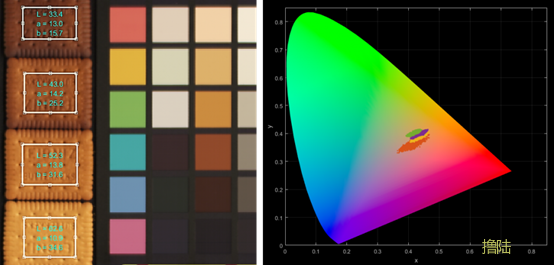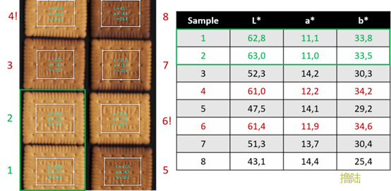 使用样本和颜色目标来训练Insight软件里面的测色功能,以输出代表饼干着色的每个像素的 L*a*b* 值。这些饼干可以通过其 L*a*b* 值很好地区分。