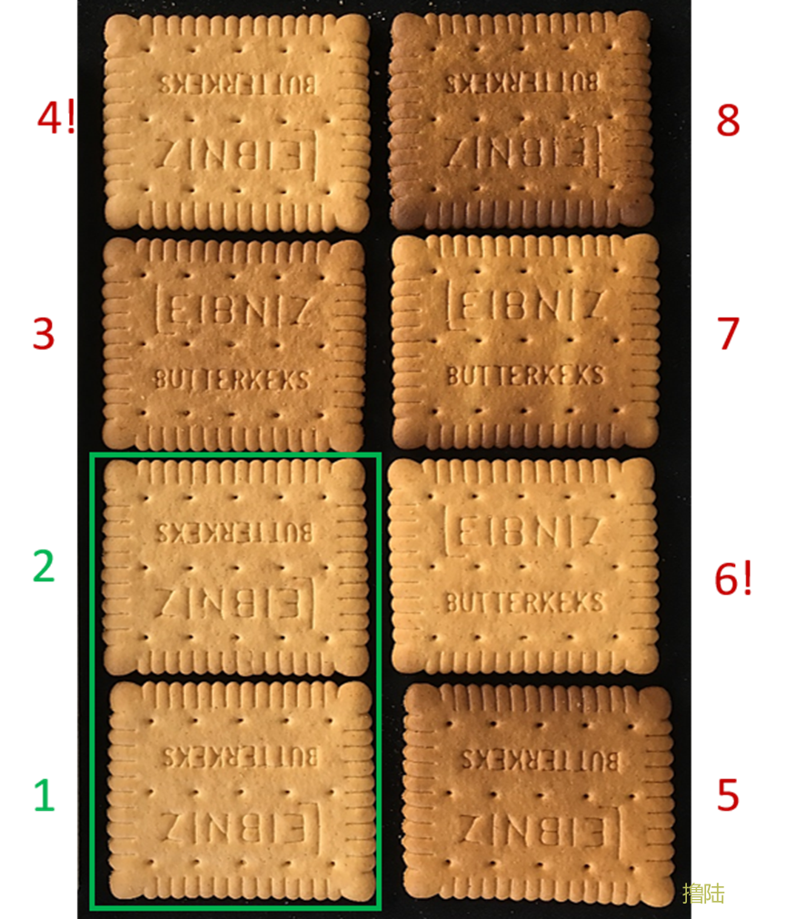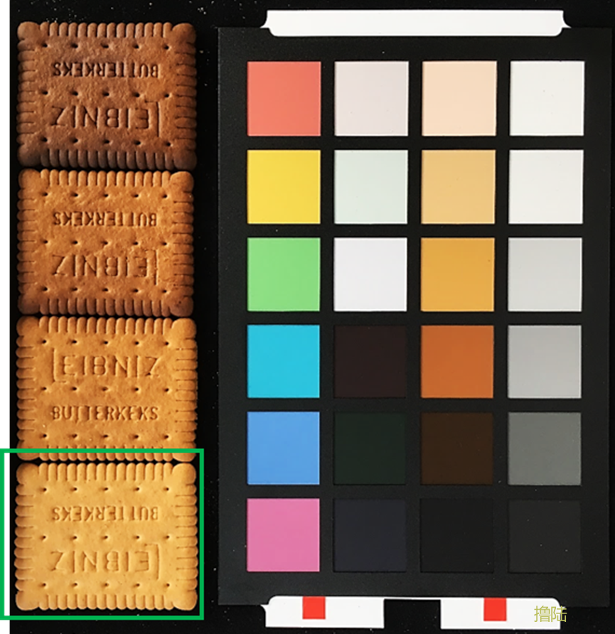 作为训练集,用高光谱相机扫描具有不同褐变的饼干和颜色目标。绿色矩形标记了饼干的原始褐变程度,就像你从超市买到的一样。