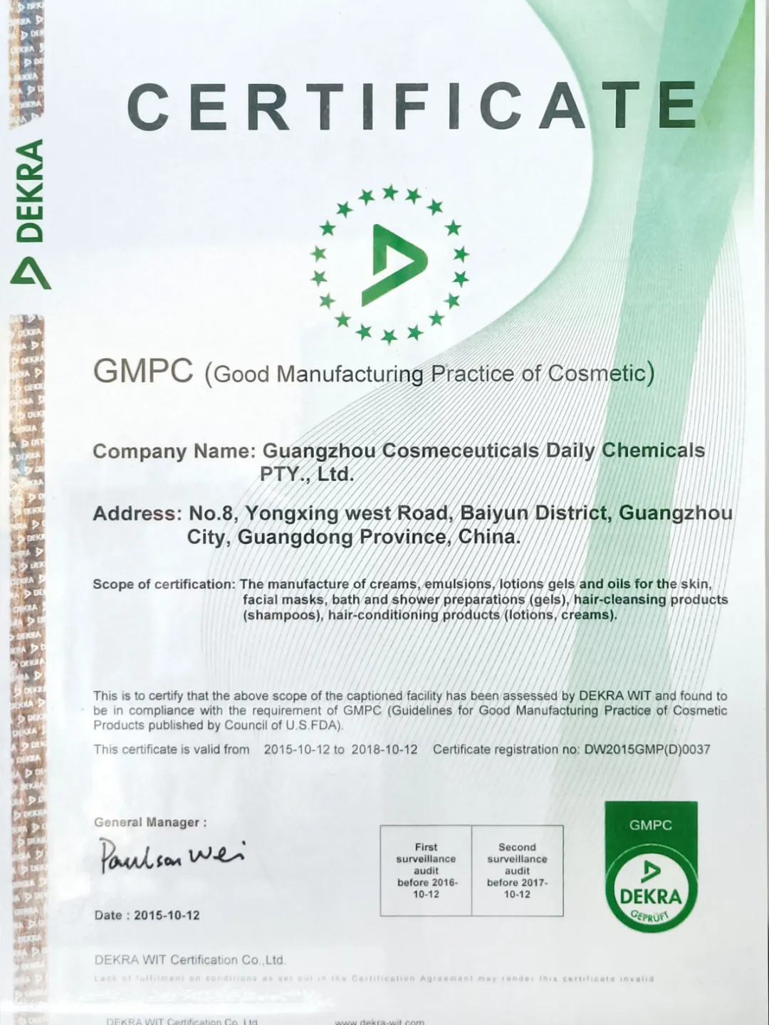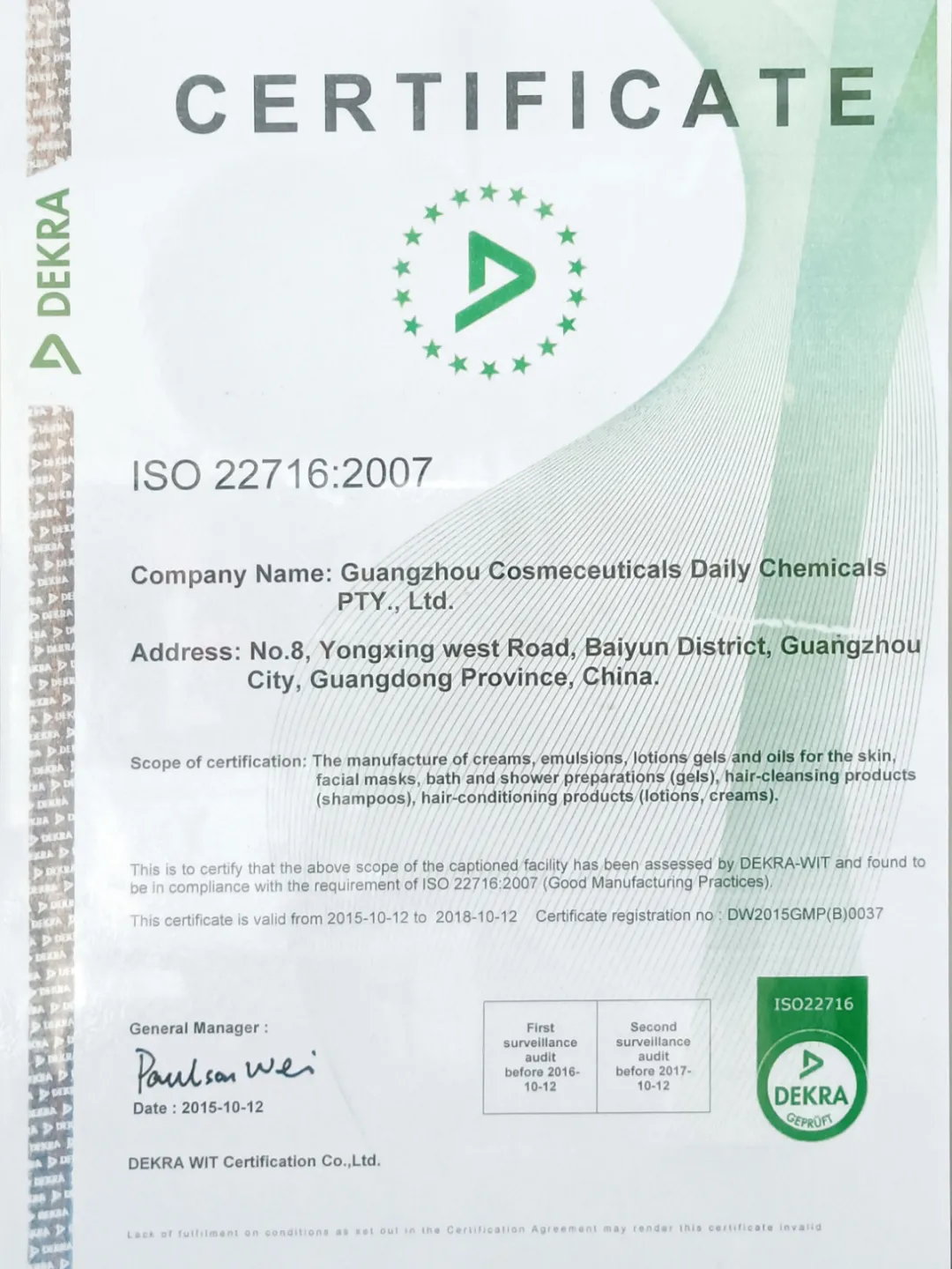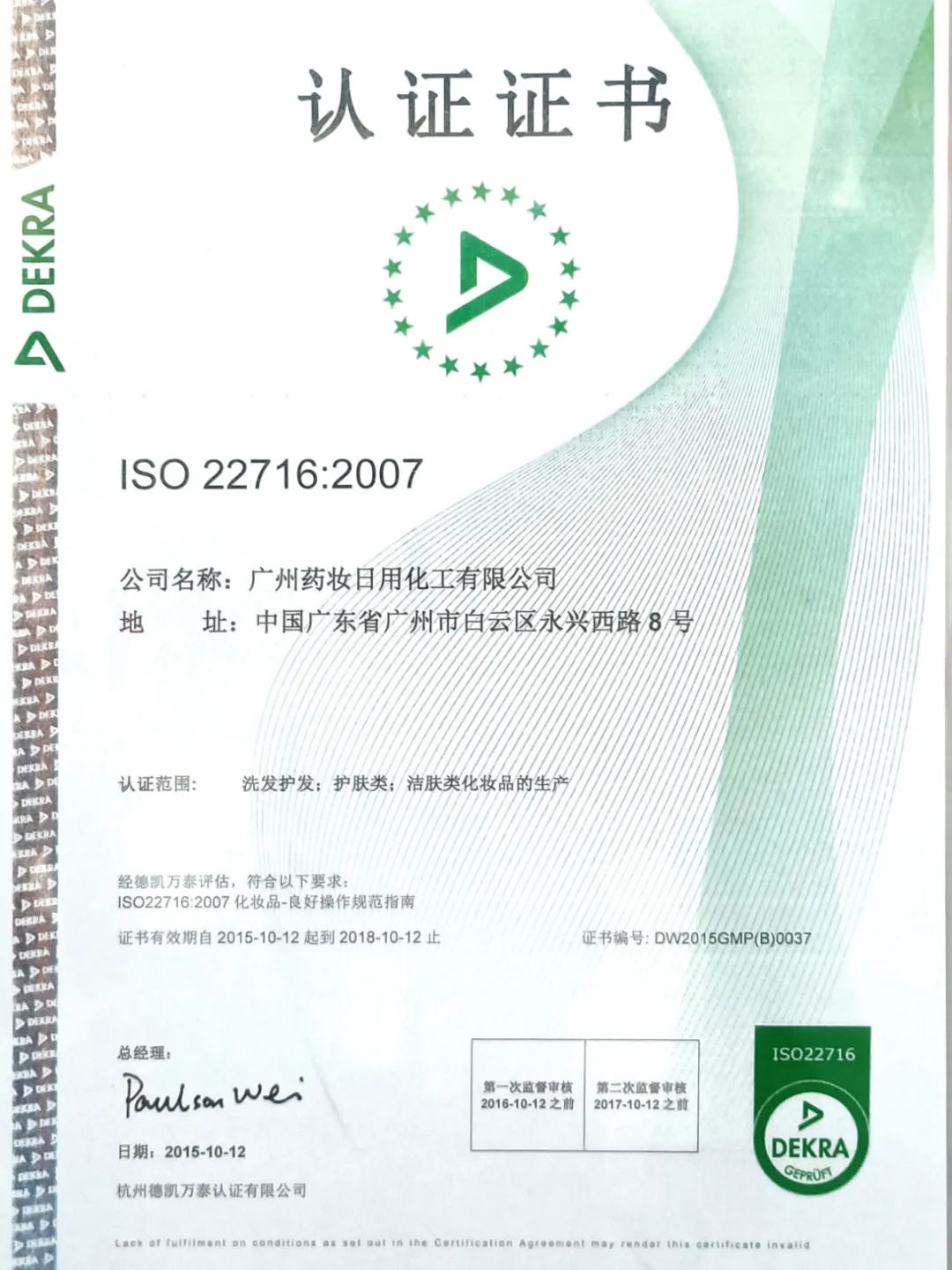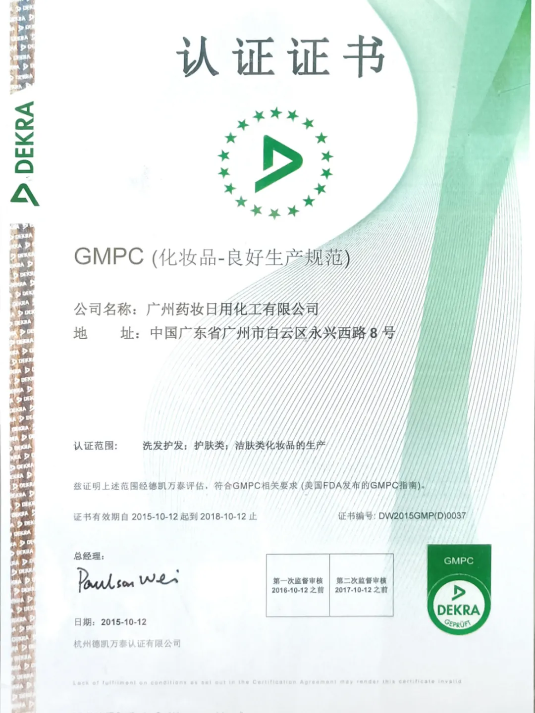 公司荣获:国际标准化组织ISO22716:2007 化妆品良好生产规范及GMPC(国际化妆品——良好生产规范)认证,获得SGS国际权威质量管理规范认证,获得CE欧盟出口产品国际权威认证