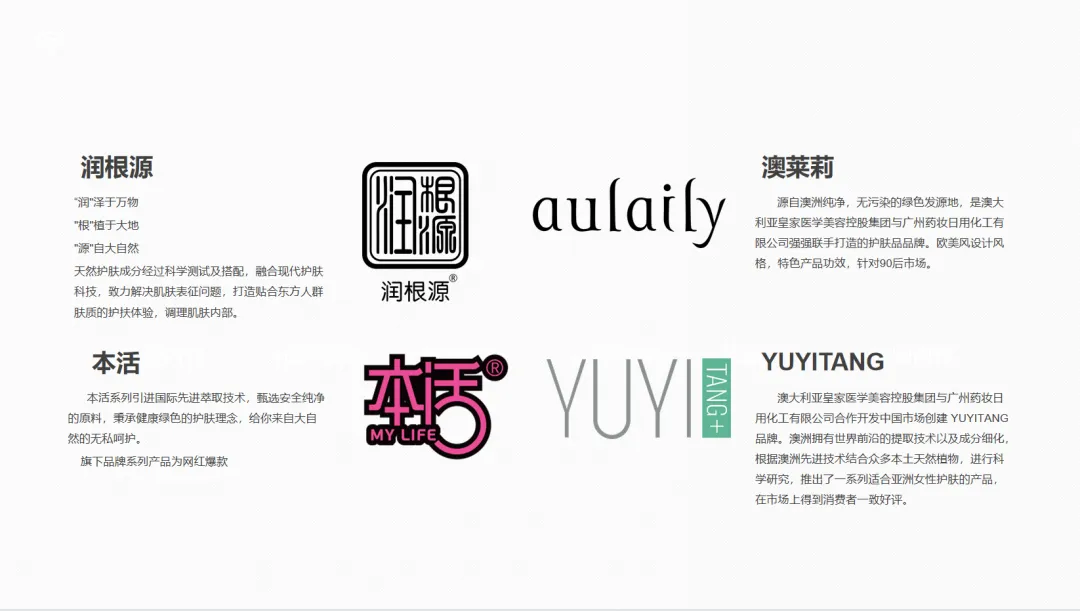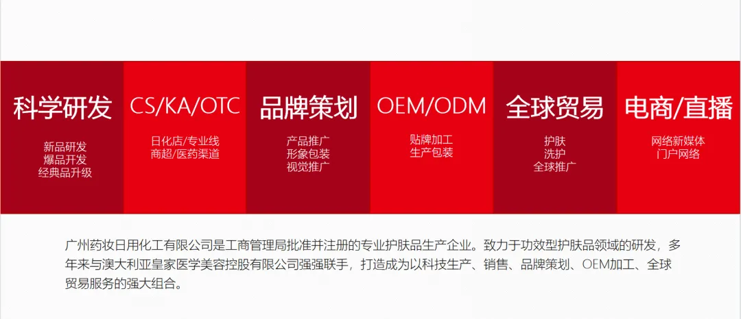 广州药妆日用化工有限公司是国家高新技术企业、“规上”企业,多年来与澳大利亚皇家医学美容控股有限公司强强联手,打造成为以科学研发、生产销售、品牌策划、OEM贴牌加工、全球贸易服务的强大组合,一直致力于天然中草药植物护肤领域的研发,生产出符合国际品质标准的化妆品。