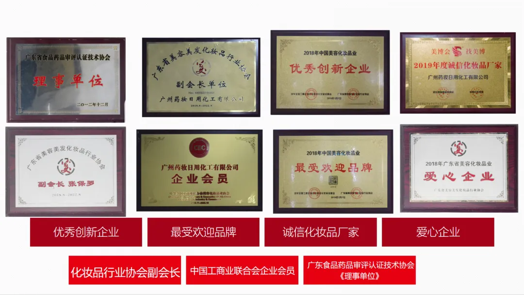 广州药妆先后被广东省美容美发化妆品行业协会评为“最受欢迎品牌”、“诚信化妆品厂家”“中国美业先锋”。与广东省商联、促进会、美协等行业重点协会有密切联系,是部分协会的副会长/常务理事单位,具有良好的交流、学习资源及平台。