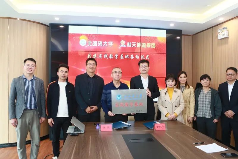 最后,史忠丰院长、谈珽董事长代表双方签订共建实践教学基地协议,签约环节后,北部湾大学石油与化工学院院长史忠丰向桂天能源集团董事长谈珽颁发实践基地牌匾,参会双方合影。