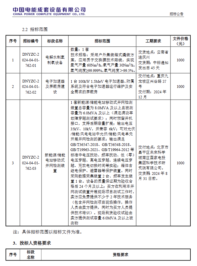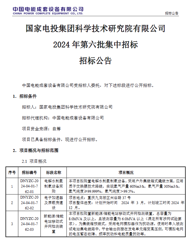 近日,国家电投集团科学技术研究院有限公司2024年第六批集中招标招标公告发布,招标范围包括电解水制氢制氧设备采购等。