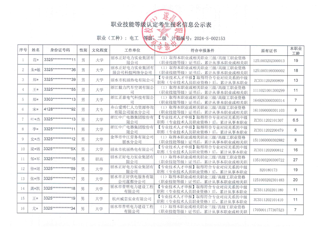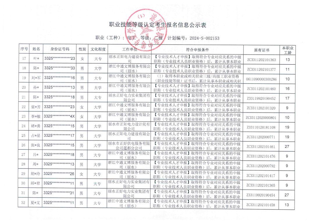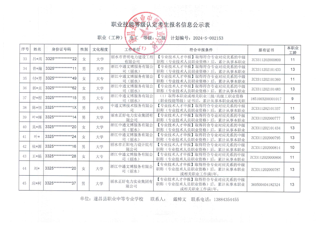 根据省人社办《浙江省社会评价组织职业技能等级认定的操作指南(试行)的通知》等相关文件要求。经遂昌县职业中等专业学校职业技能人才评价中心对考生报名材料进行审核,批次号2024-S-002153范里、朱炜敏等45名电工二级考生报名资格符合以下申报条件:(1)取得本职业或相关职业三级/高级工职业资格(职业技能等级)证书后,累计从事本职业或相关职业工作满5年。(2)【专业技术人才申报】取得符合专业对应关系的中级职称(专业技术人员职业资格)后,累计从事本职业或相关职业工作满1年。现将合格名单予以公示,凡对公示情况有异议的,请在公示期内,向我中心反映。遂昌县职业中等专业学校培训中心