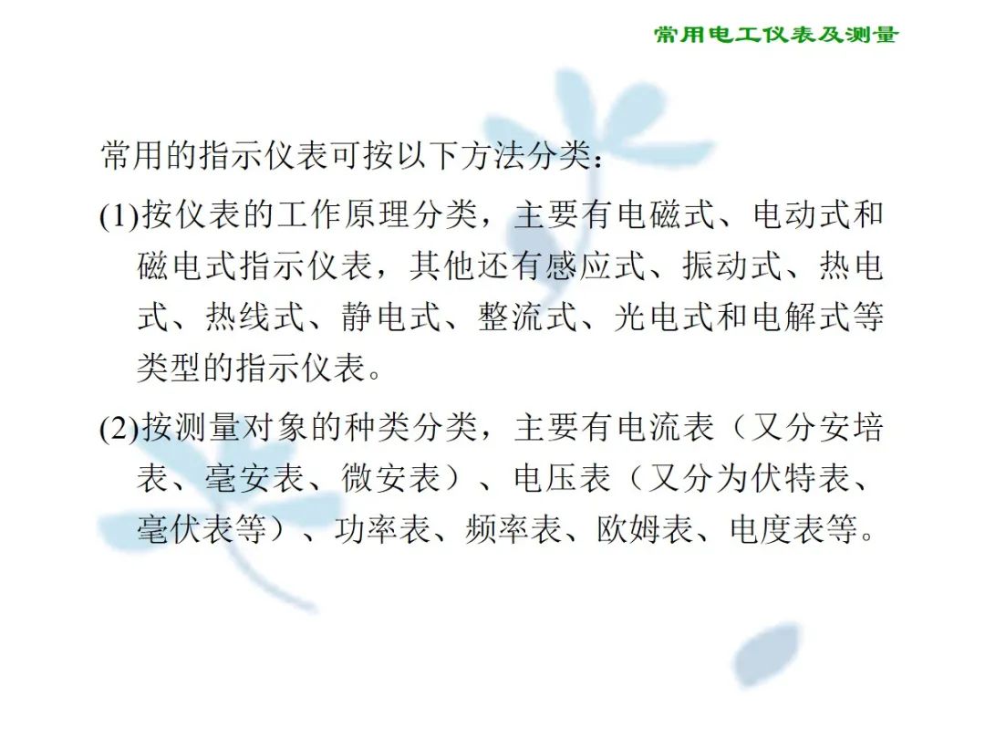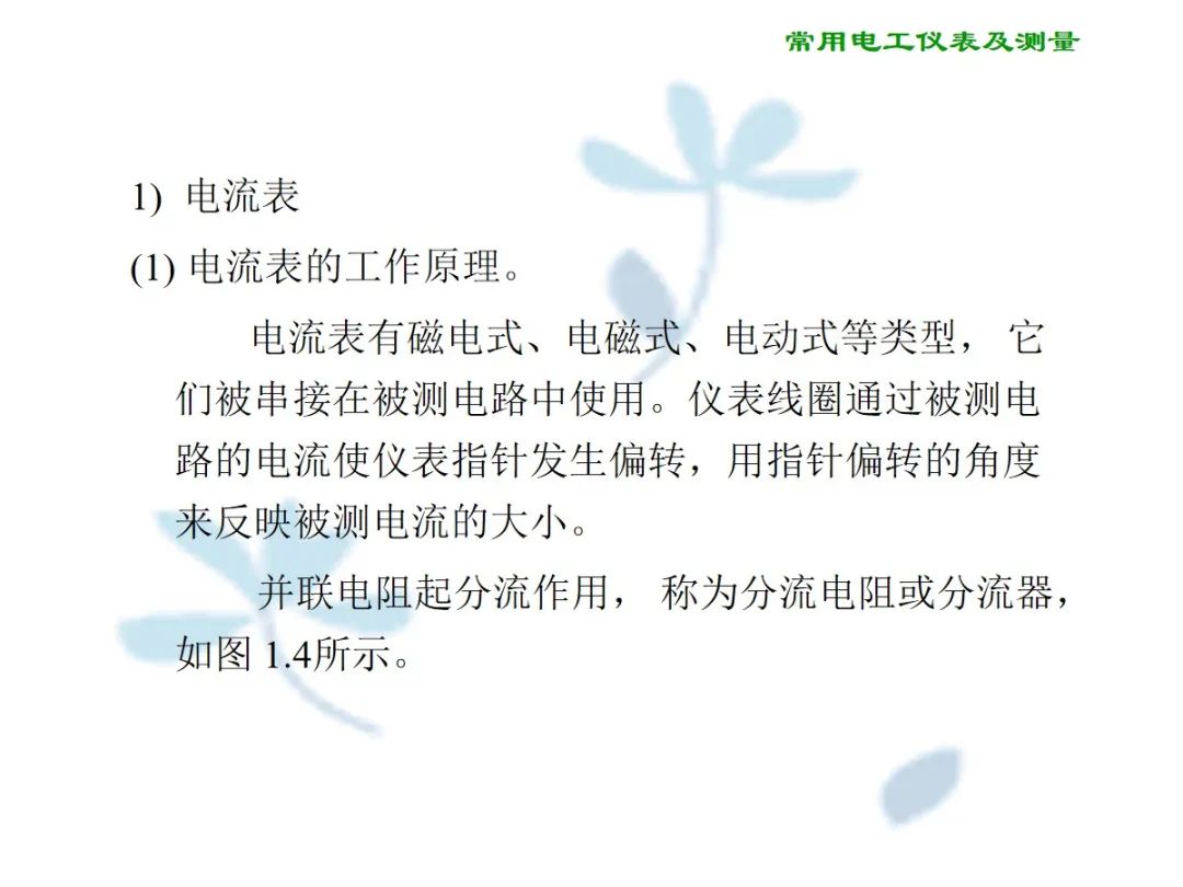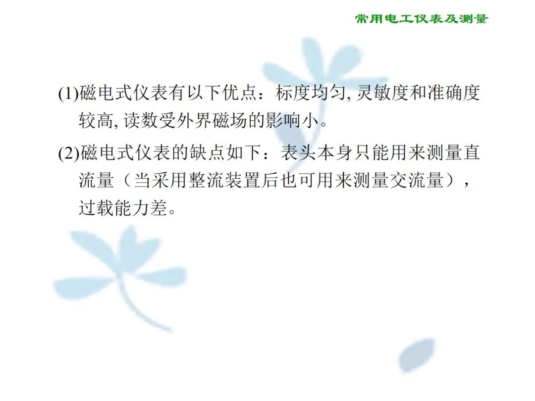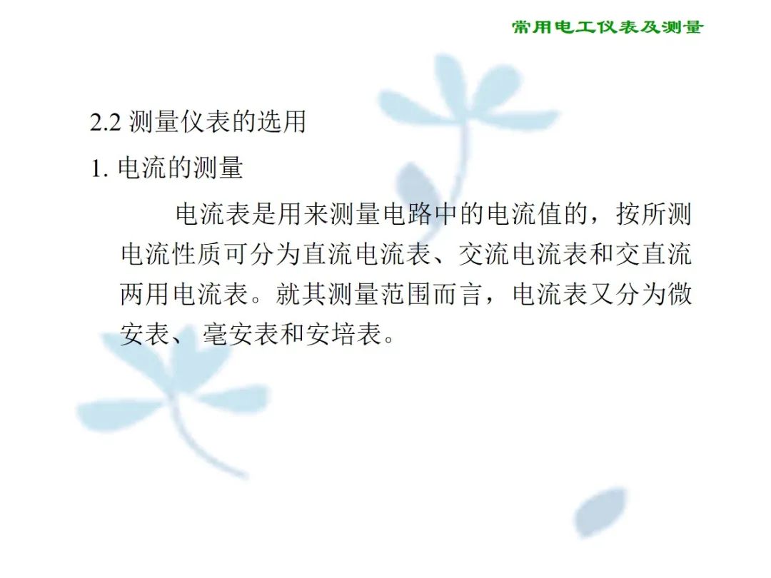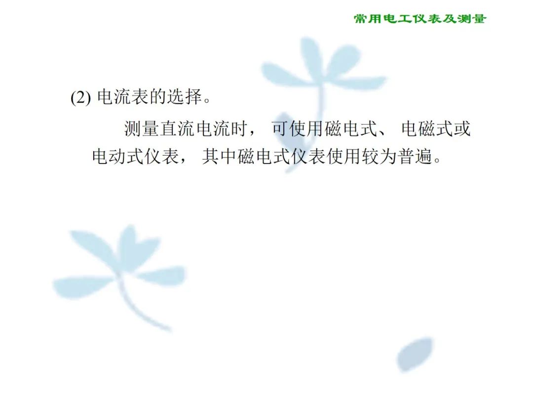 测量直流电流时,较为普遍的是选用磁电式仪表,也可使用电磁式或电动式仪表。测量交流电流时,较多使用的是电磁式仪表,也可使用电动式仪表。对测量准确度要求高、灵敏度高的场合应采用磁电式仪表;对测量精度要求不严格、被测量较大的场合常选择价格低、过载能力强的电磁式仪表。