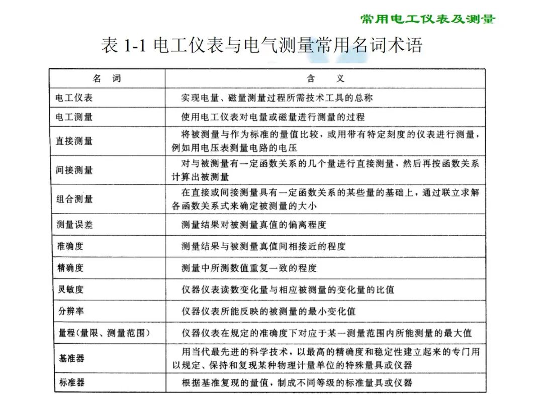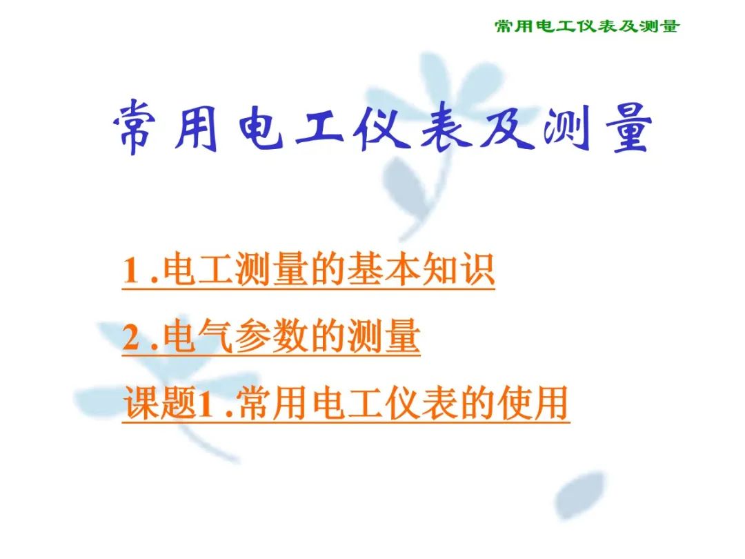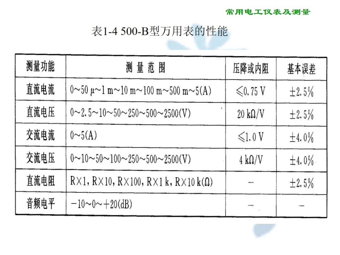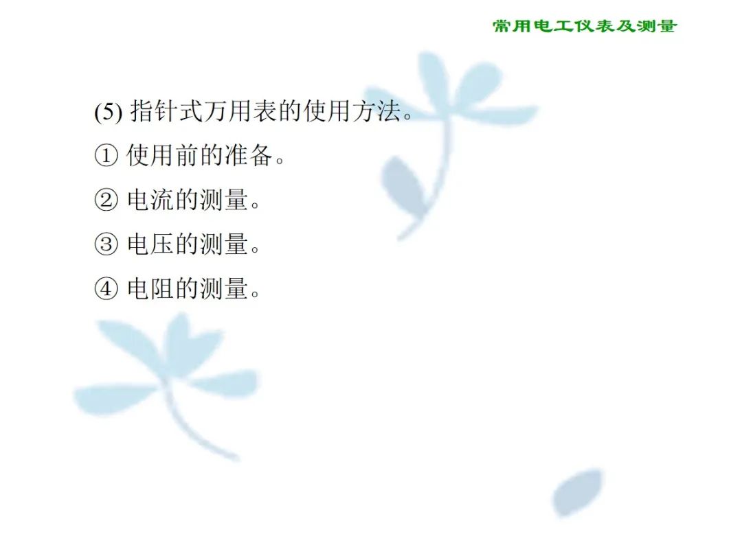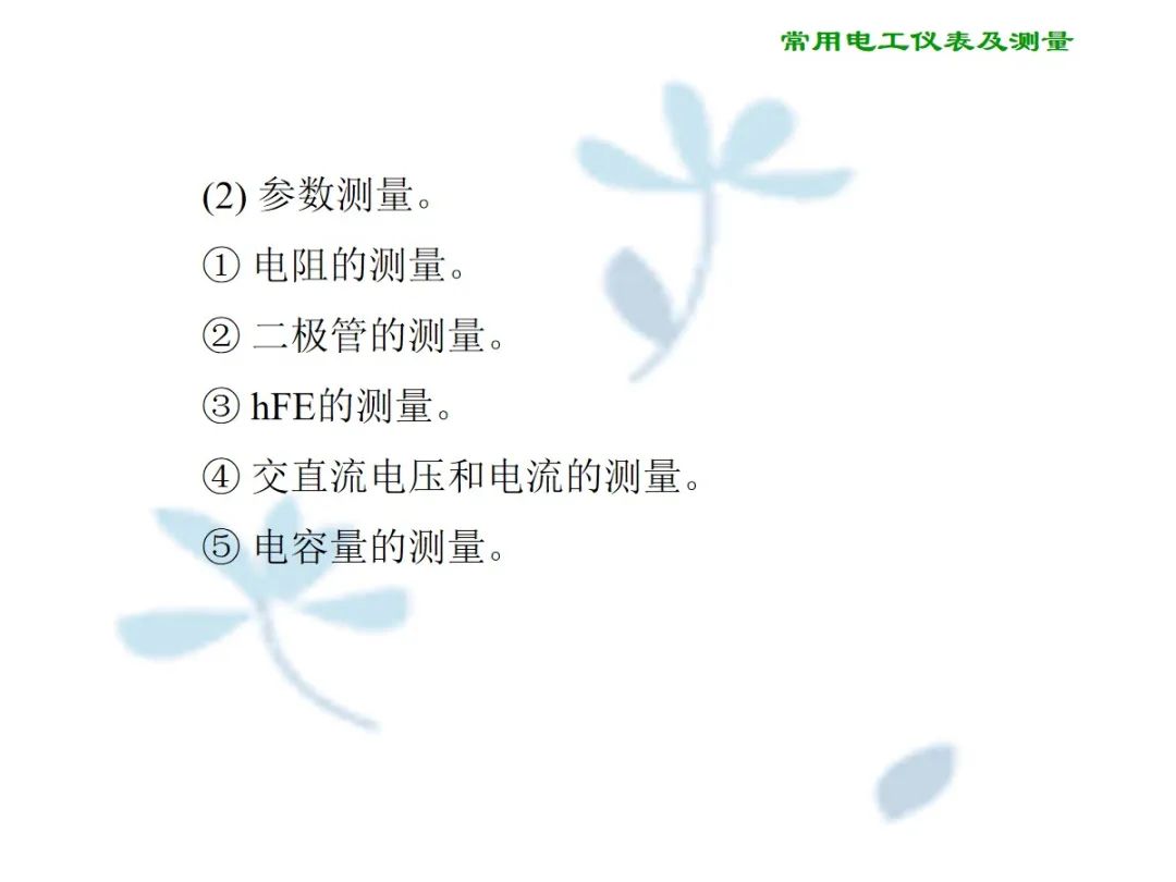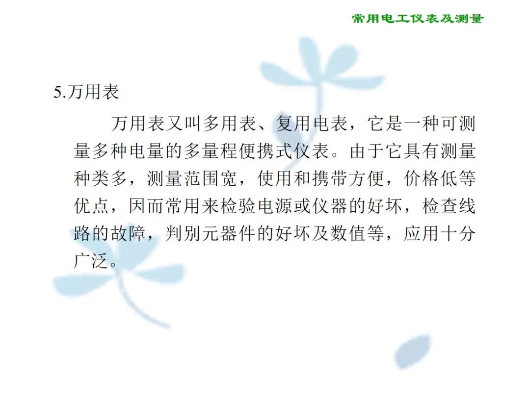 万用表能测量直流电流、直流电压、交流电压和电阻等,有的还可以测量功率、电感和电容等,是电工最常用的仪表之一。