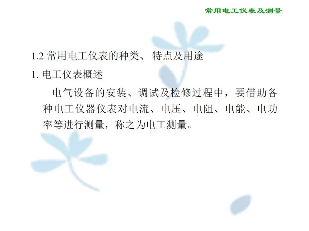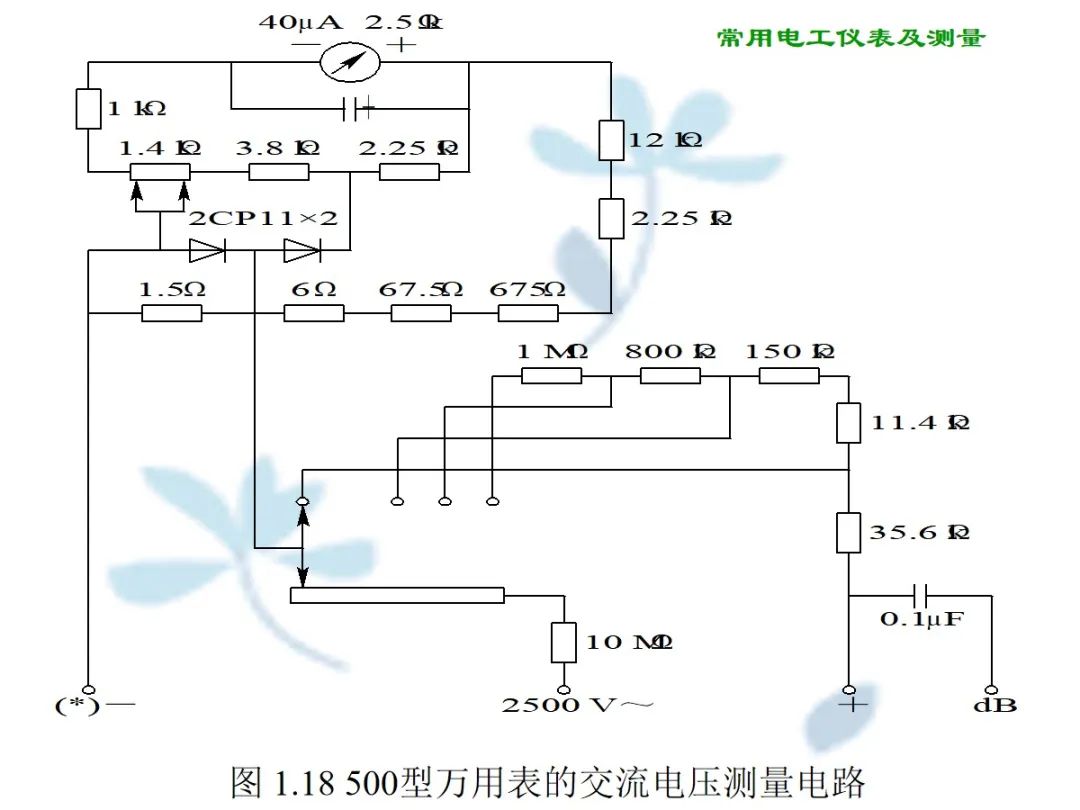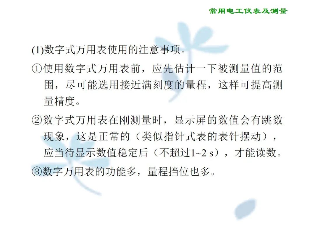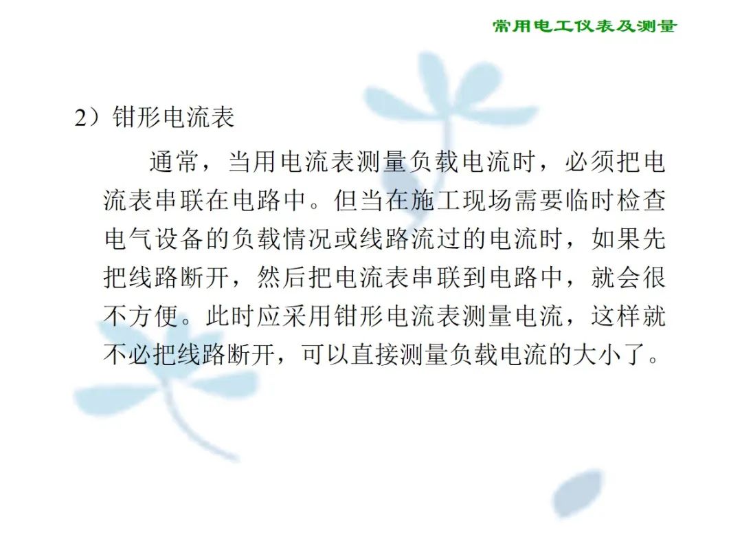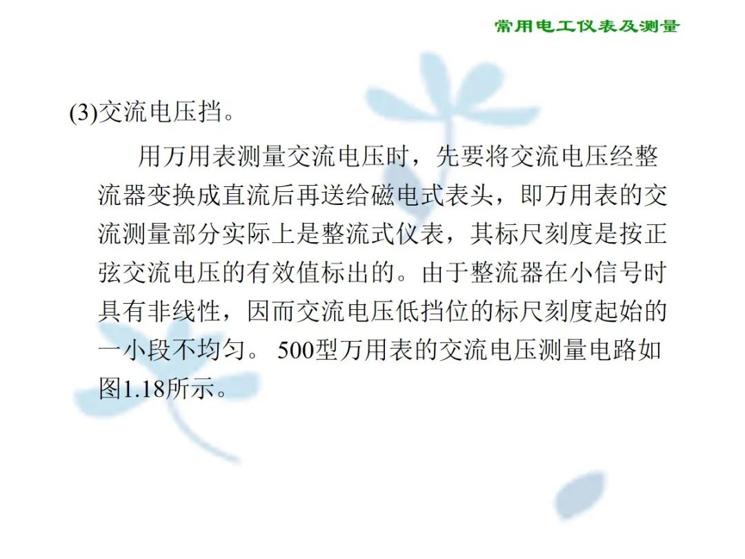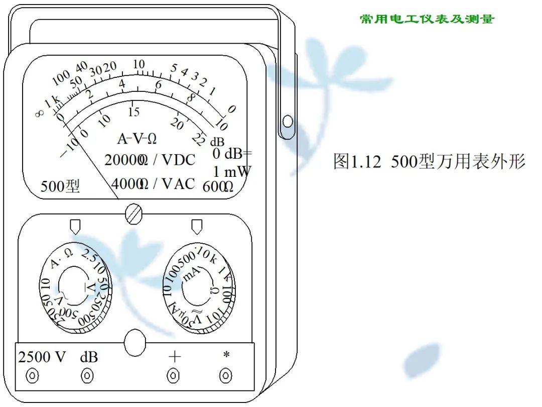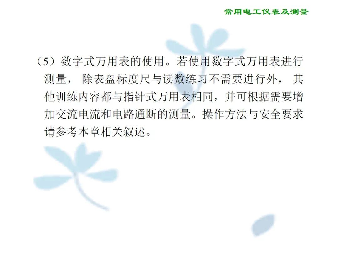 万用表能测量直流电流、直流电压、交流电压和电阻等,有的还可以测量功率、电感和电容等,是电工最常用的仪表之一。