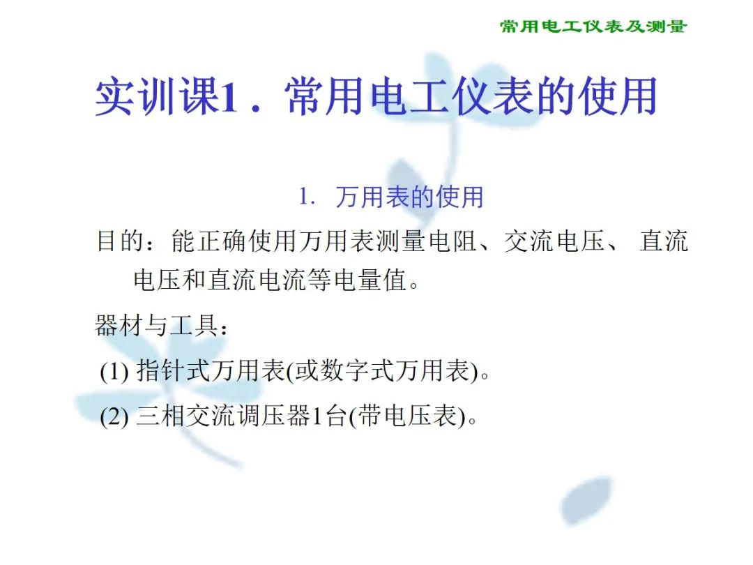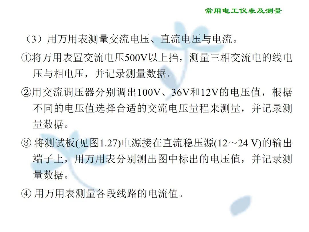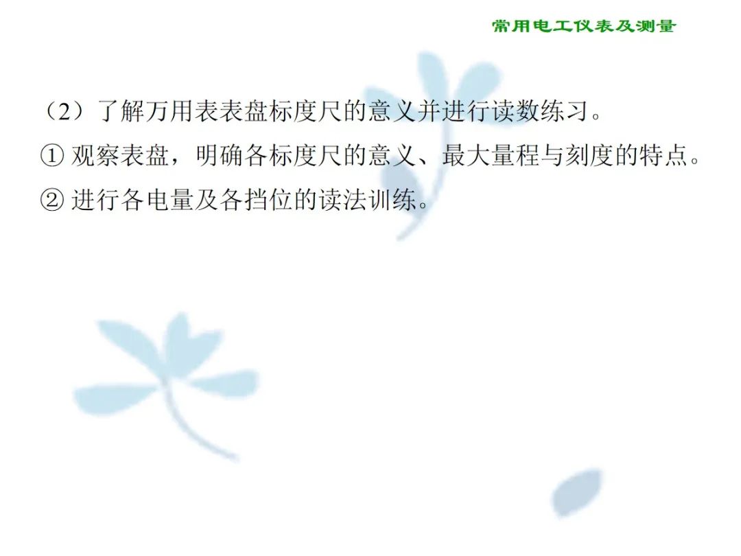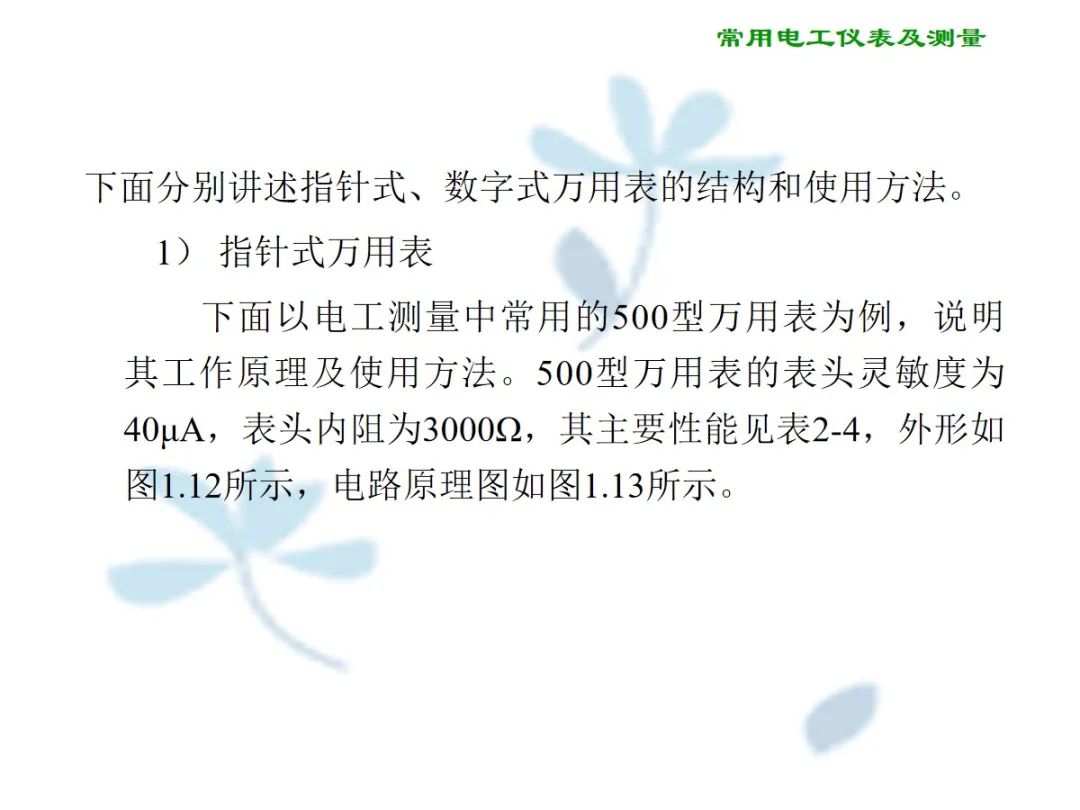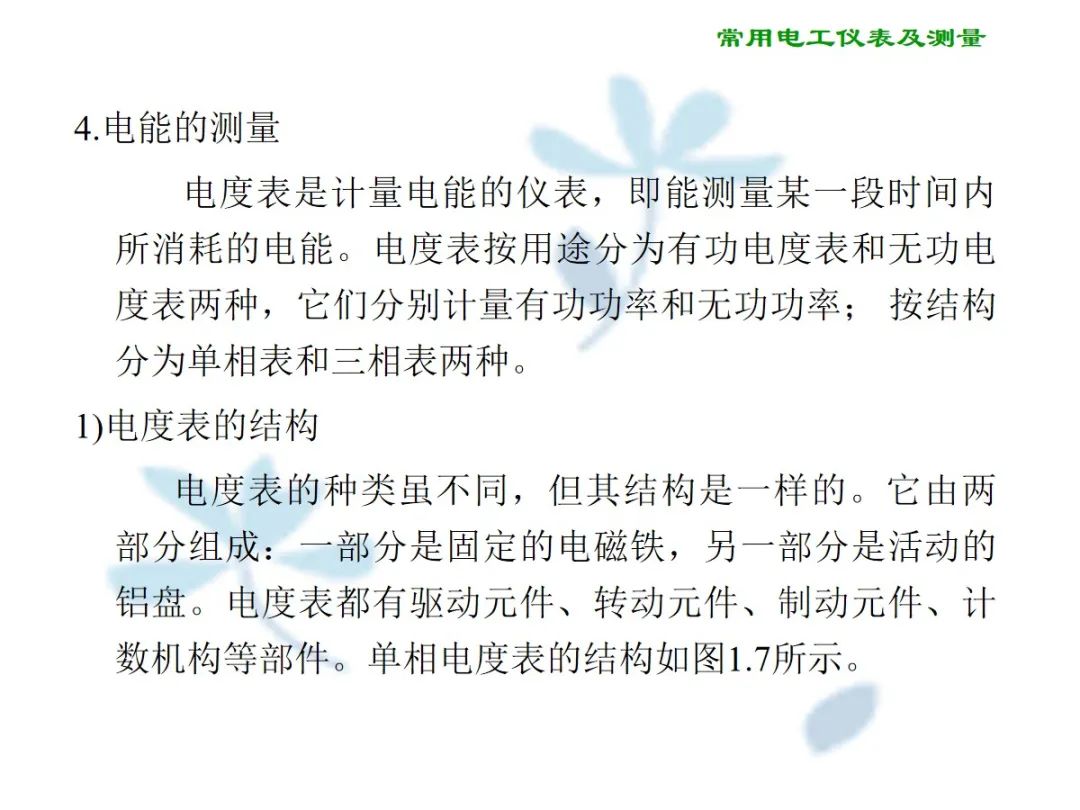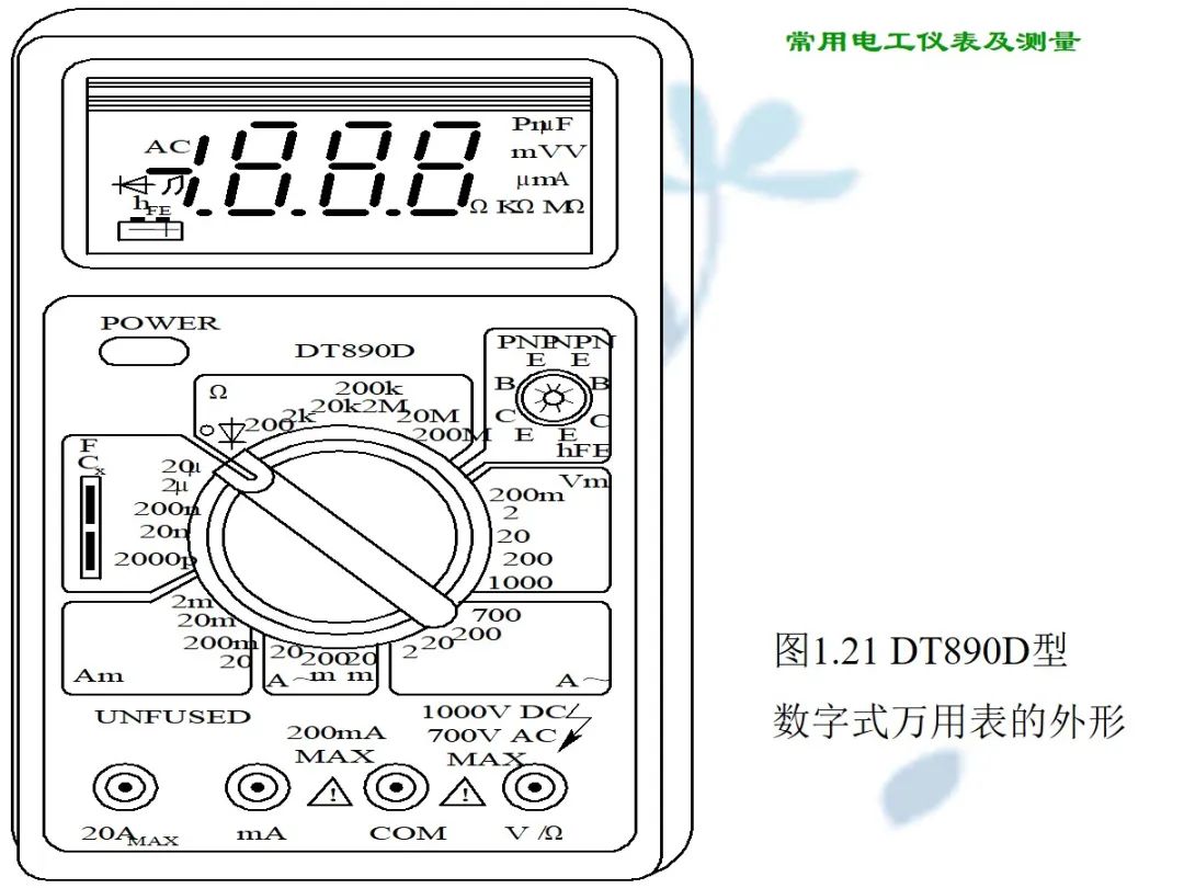 万用表能测量直流电流、直流电压、交流电压和电阻等,有的还可以测量功率、电感和电容等,是电工最常用的仪表之一。