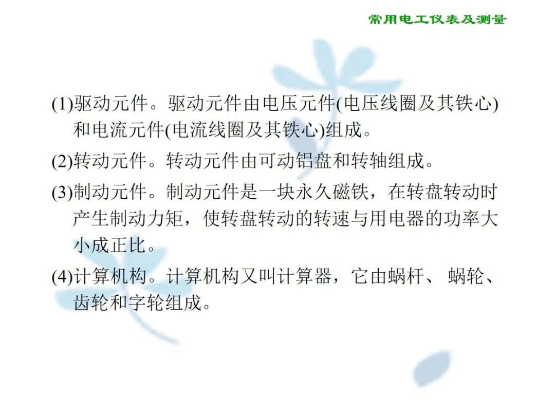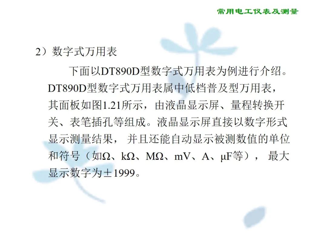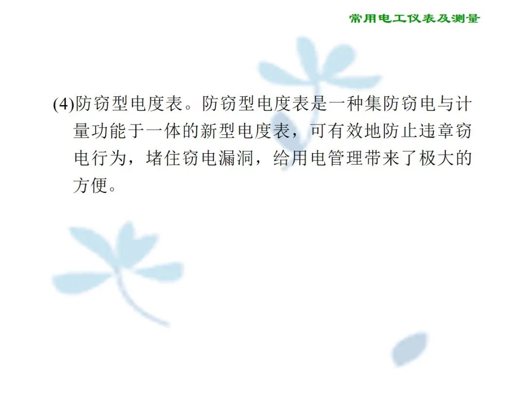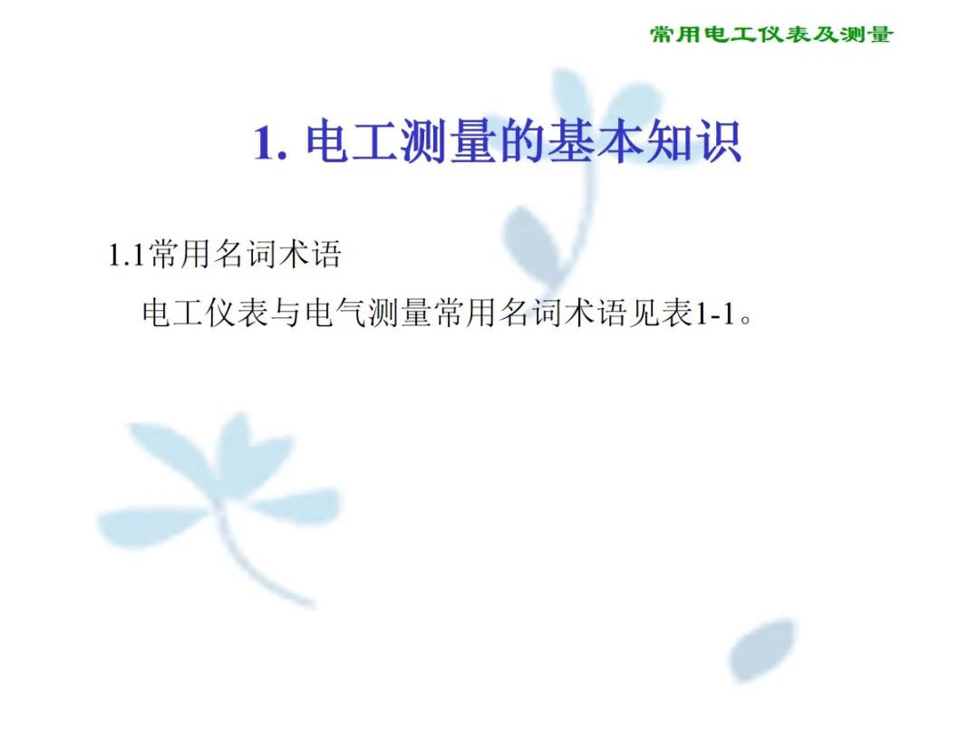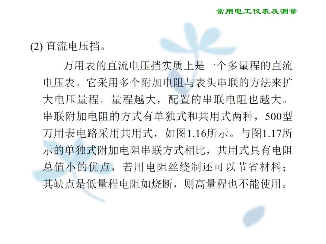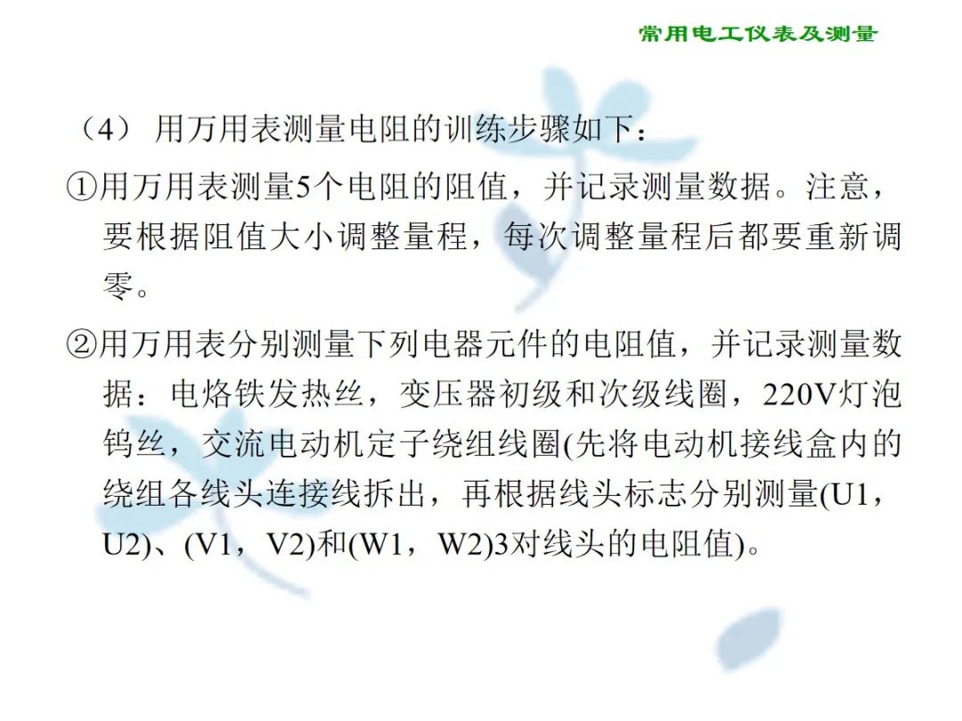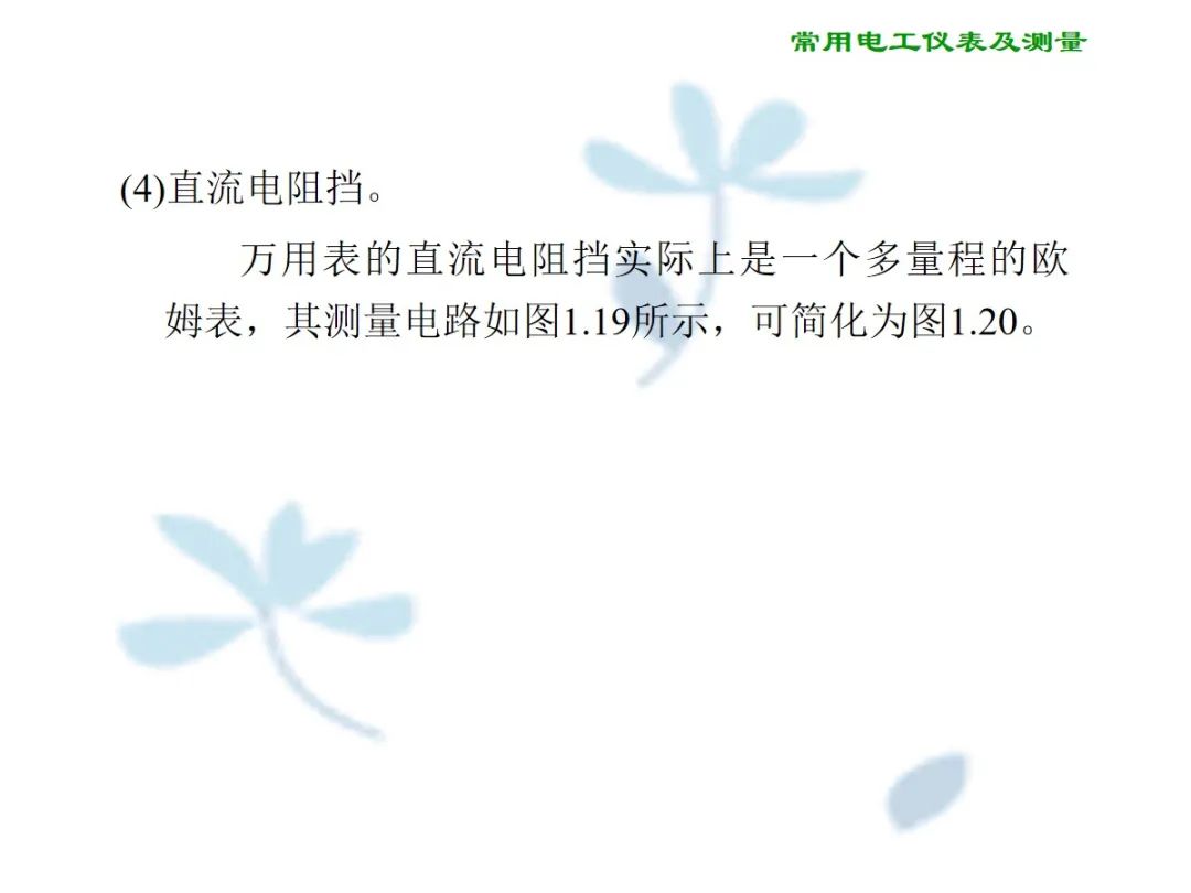 万用表能测量直流电流、直流电压、交流电压和电阻等,有的还可以测量功率、电感和电容等,是电工最常用的仪表之一。