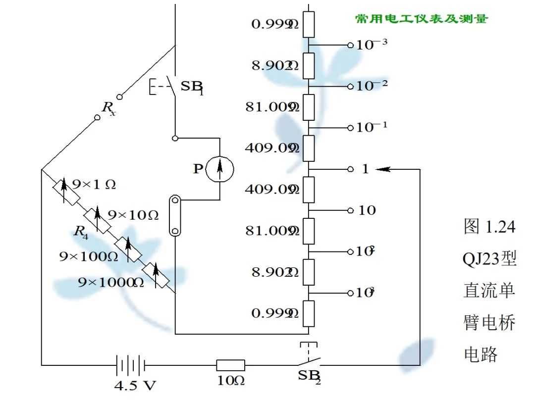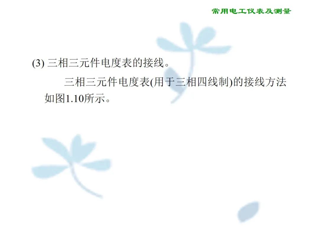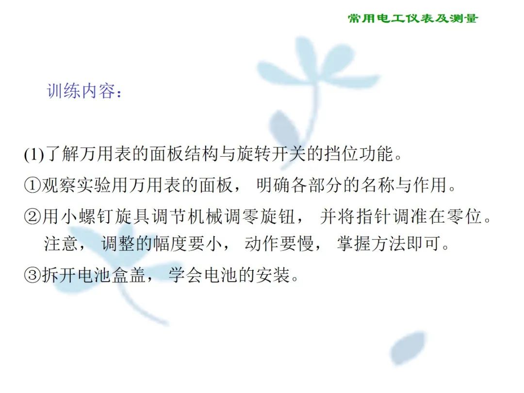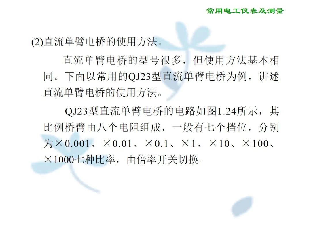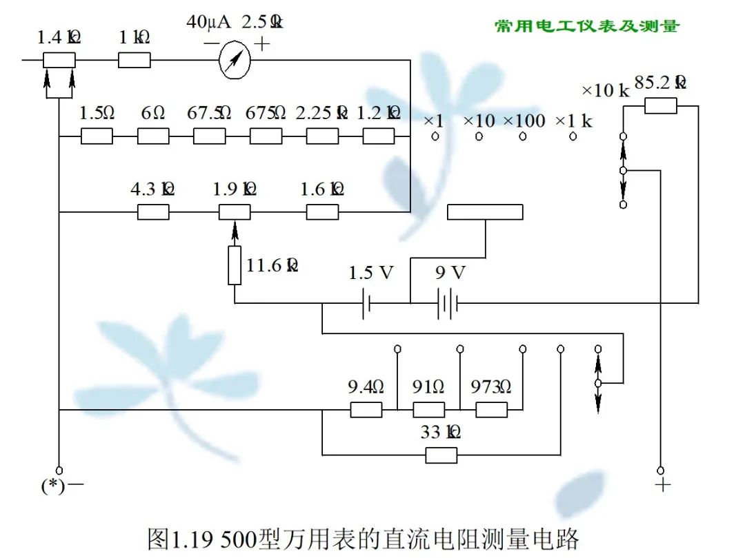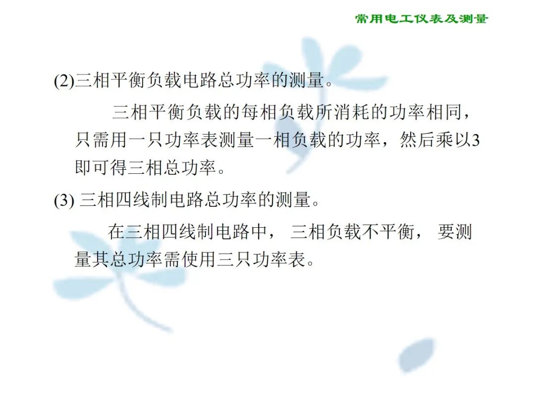万用表能测量直流电流、直流电压、交流电压和电阻等,有的还可以测量功率、电感和电容等,是电工最常用的仪表之一。