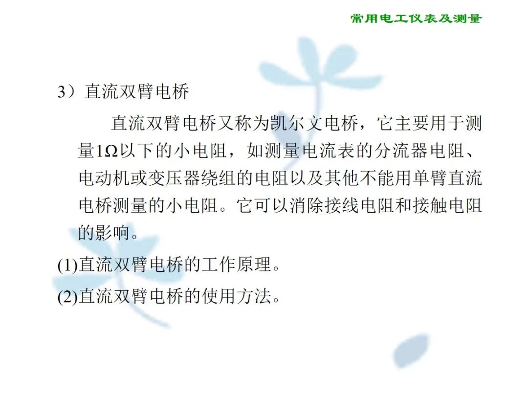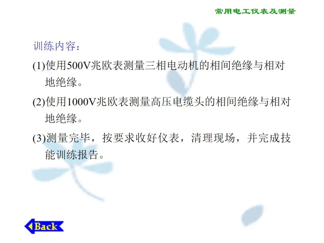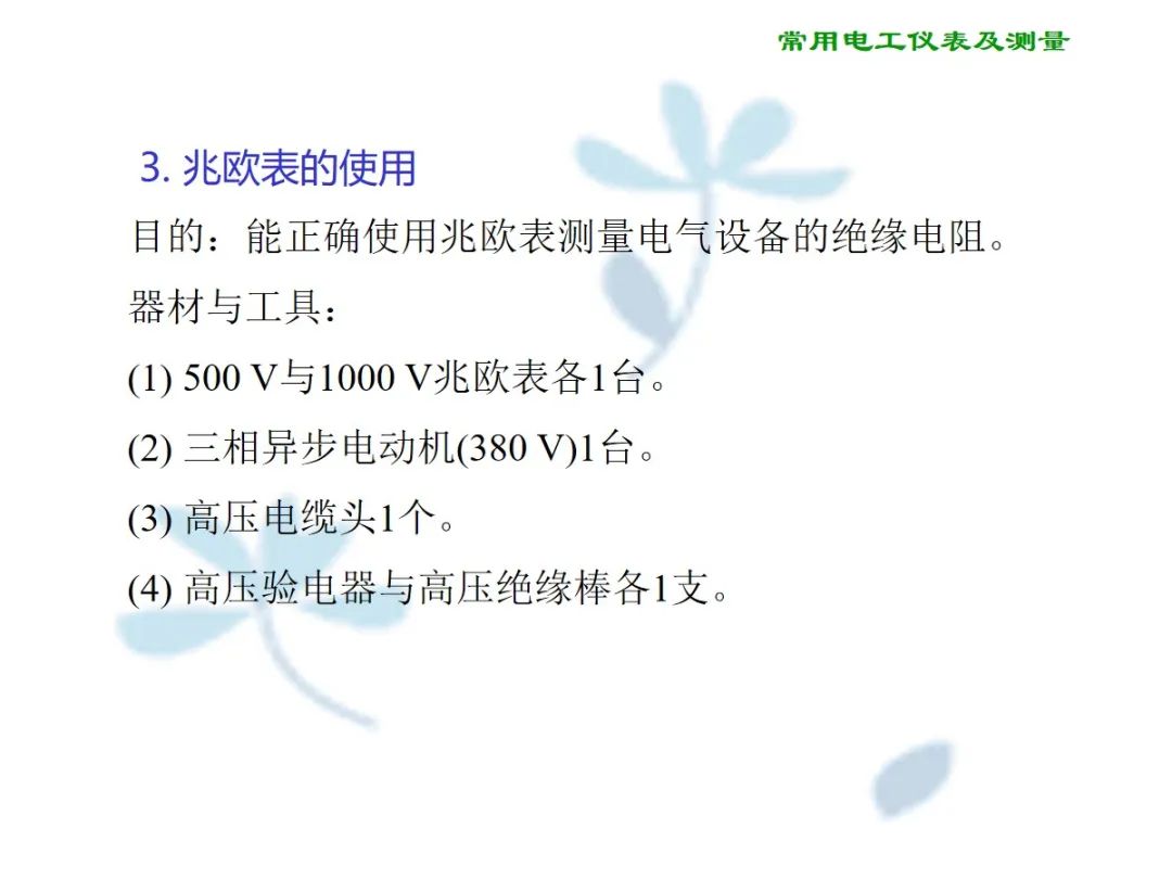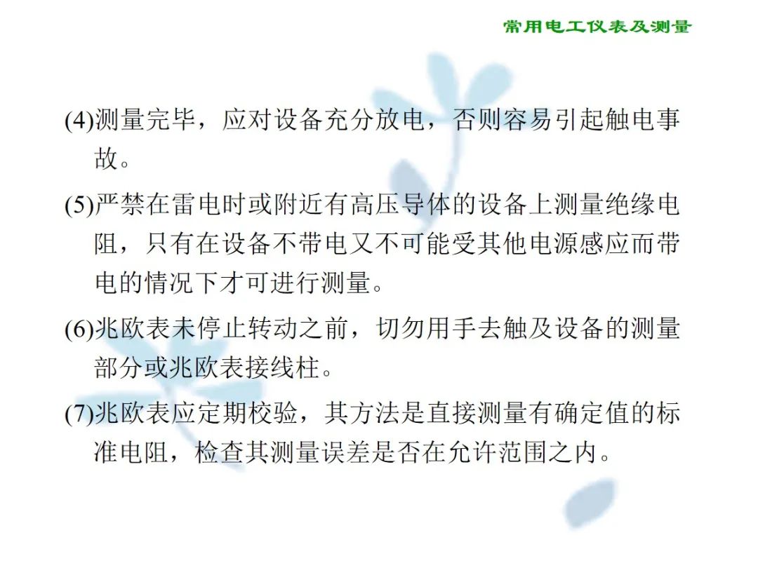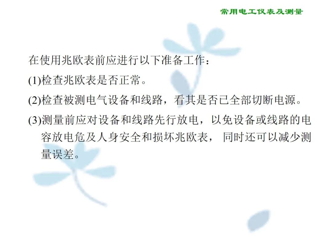 (2)测量电气设备的绝缘电阻时,必须先切断电源,然后将设备进行放电,以保证人身安全和测量准确。