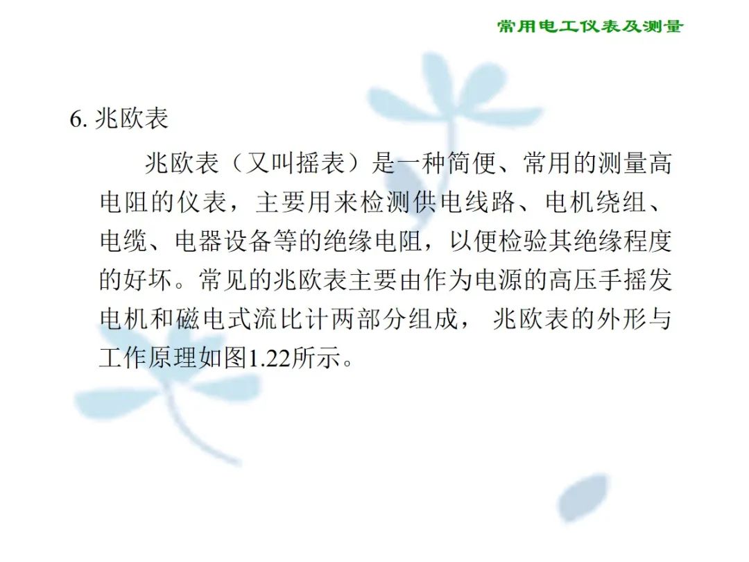 欧兆表俗称摇表,是用来测量大电阻和绝缘电阻的,它的计量单位是兆欧(MΩ),故称兆欧表。兆欧表的种类有很多,但其作用大致相同。