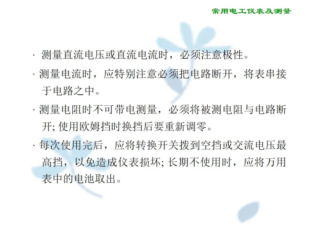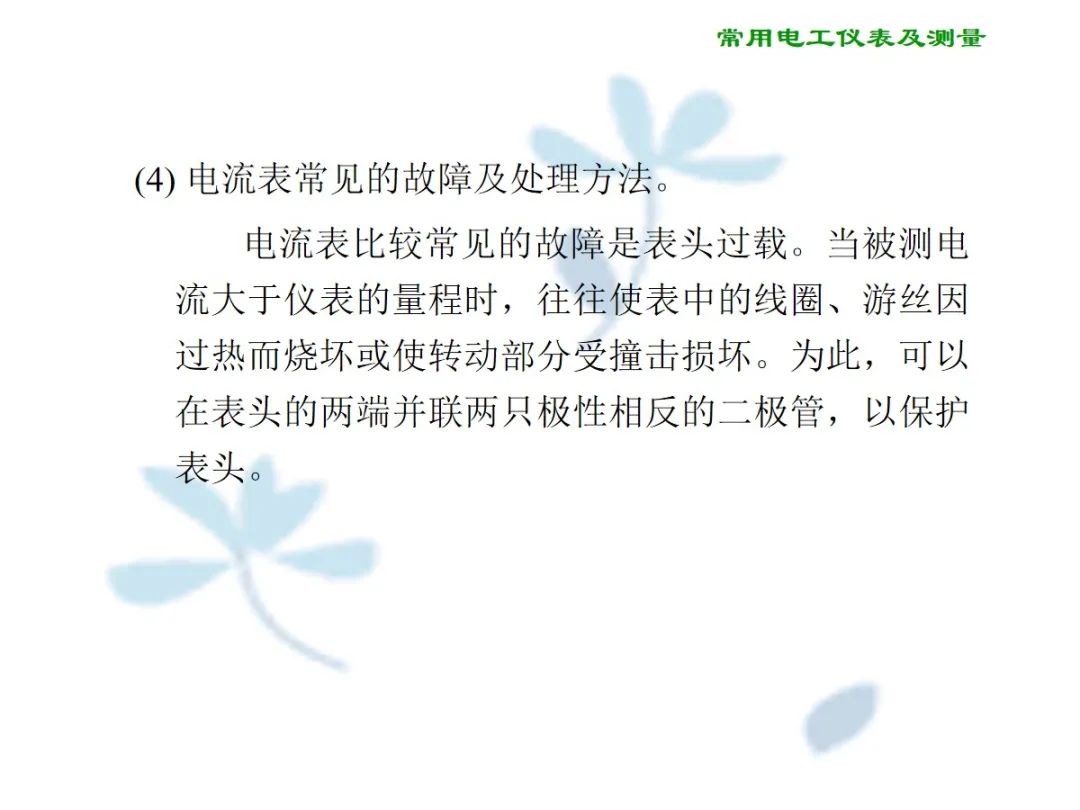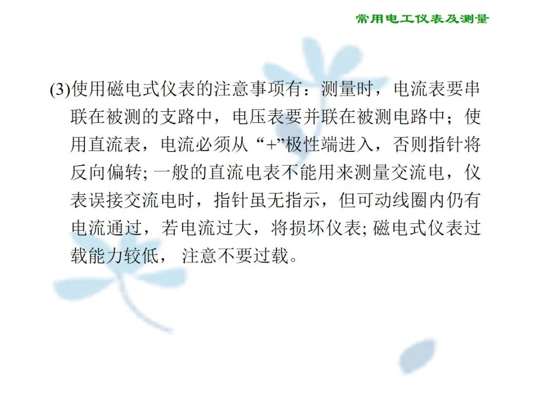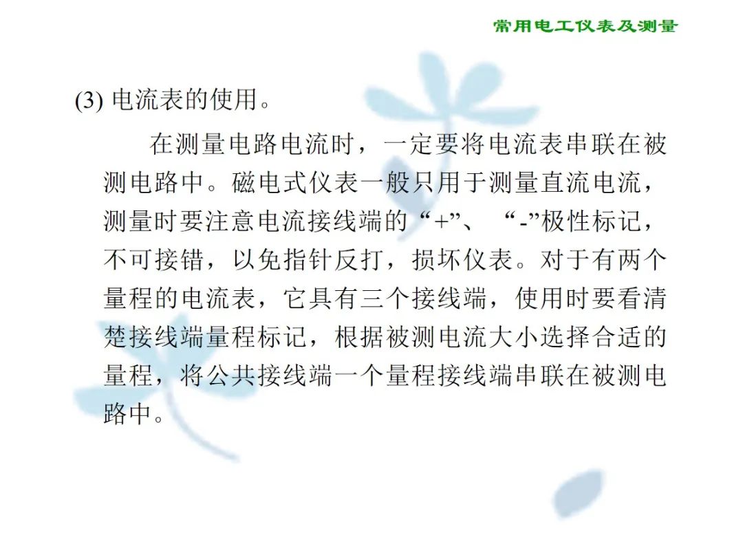 (2)测量直流电流时,电流表接线端的“+”、“—”极性不可接错,否则可能损坏仪表。磁电式电流表一般只用于测量直流电流。