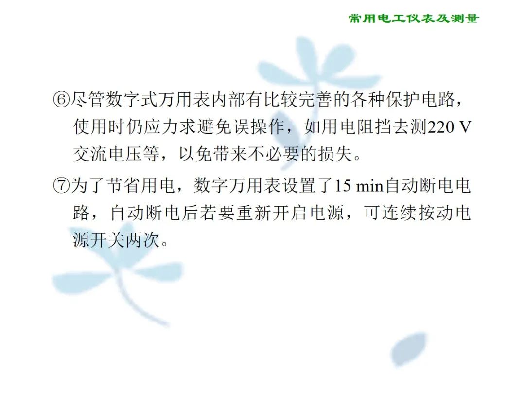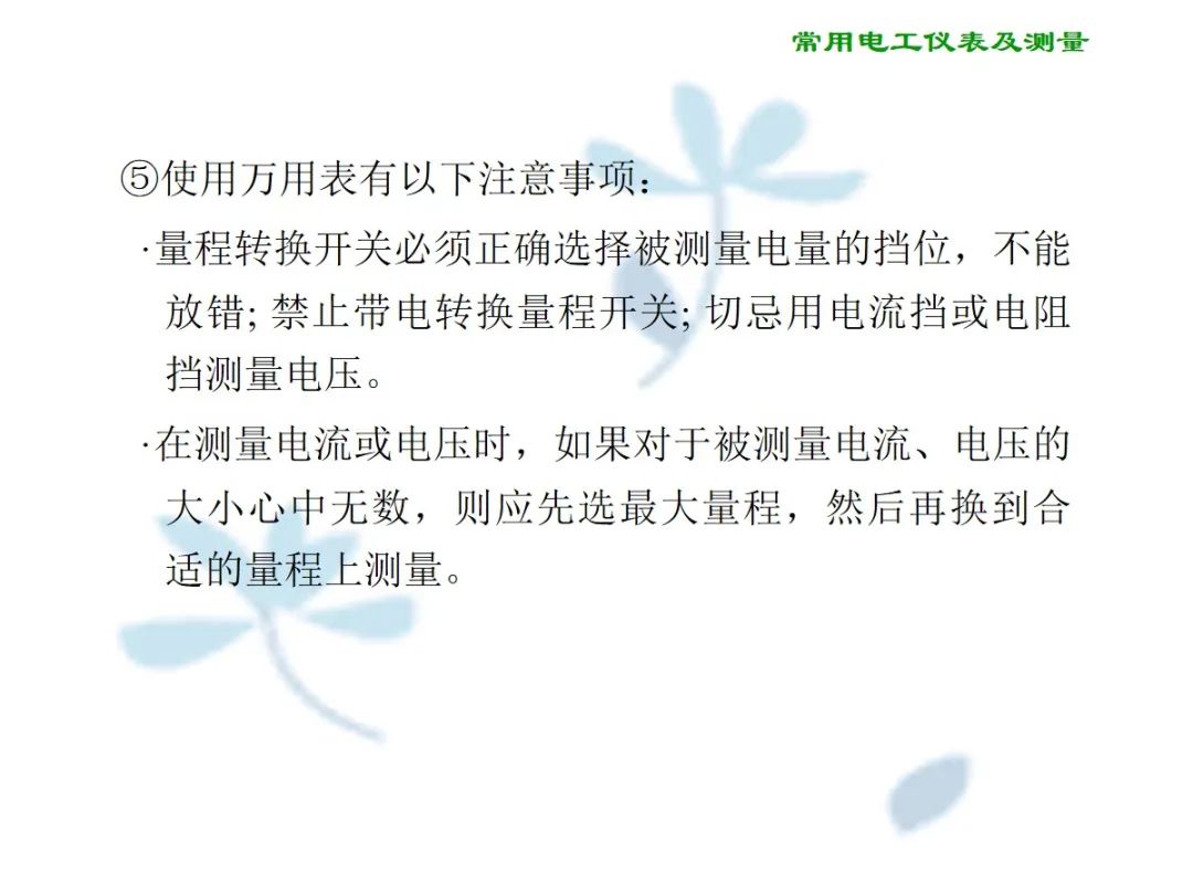 ③万用表用完后最好将转换开关转到交流电压最高量程档,此档对万用表最安全,以防下次测量时疏忽而损坏万用表。