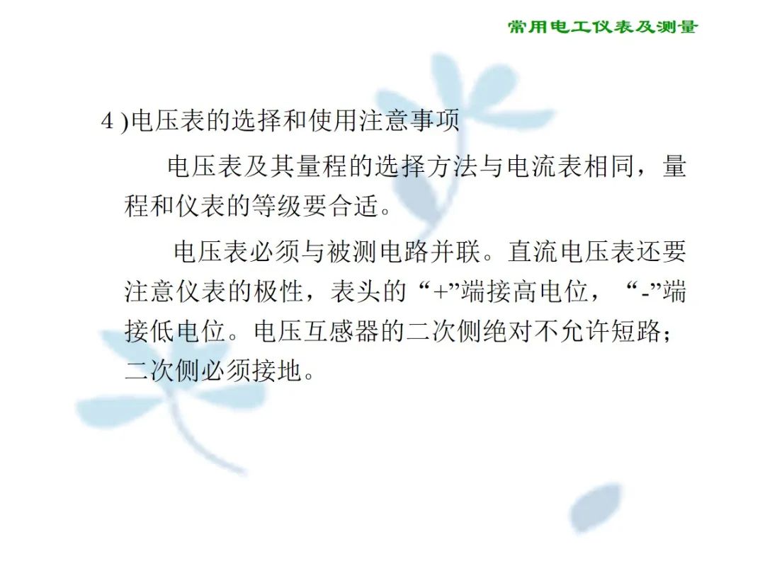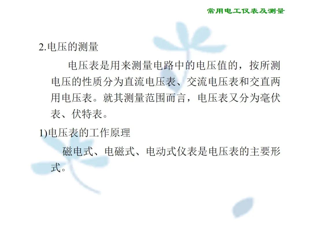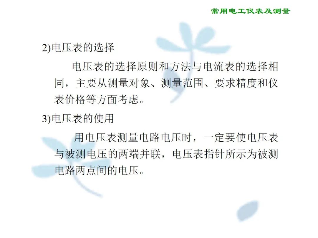 电压表的选择原则和方法与电流表的选择基本相同,主要从测量对象、测量范围、要求精度和仪表价格等几方面考虑。测量精度要求不高,一般多用电磁式电压表。而对测量精度和灵敏度要求高的,多常采用磁电式多量程电压表,其中普遍使用的是万用表的电压档。