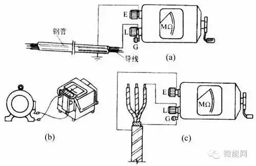 测量电缆的导电线芯与电缆外壳的绝缘电阻时,将接线柱E与电缆外壳相连接,接线柱L与线芯连接,同时将接线柱G与电缆壳、芯之间的绝缘层相连接,如上图c所示。