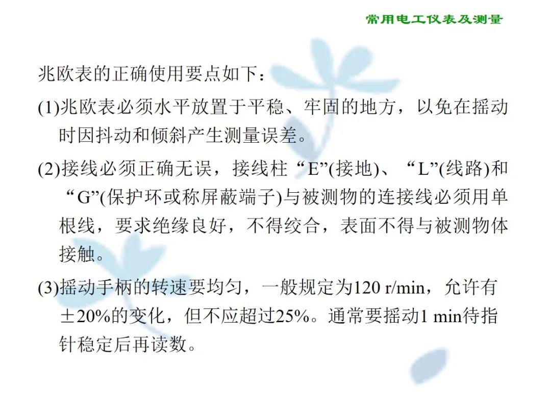(3)兆欧表测量时应放在水平位置,并用力按住兆欧表,防止在摇动中晃动,摇动的转速为120转/分钟。