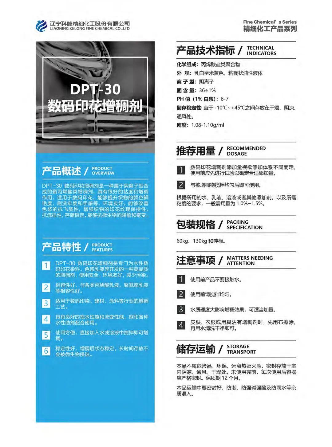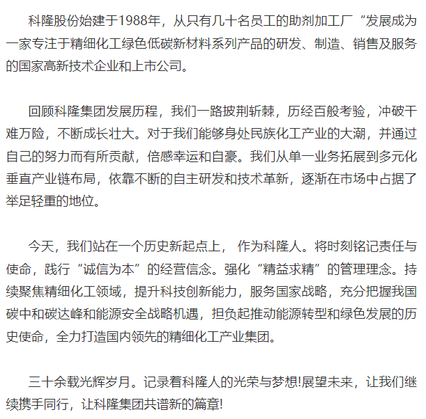辽宁科隆精细化工股份有限公司始建于2002年,经过10多年的创业历程,已经发展成为国内精细化学品专业制造企业,在行业中享有盛誉。公司创建伊始,就以“以我为主、博采众长、融合提炼、自成一家”为企业宗旨,强调“科技以人为本,科技为人服务”。精心构筑平台,吸纳人才,不懈追求“卓越品质,完美服务”,集科技之精英,攻关核心技术,重点发展非离子表面活性剂系列产品。