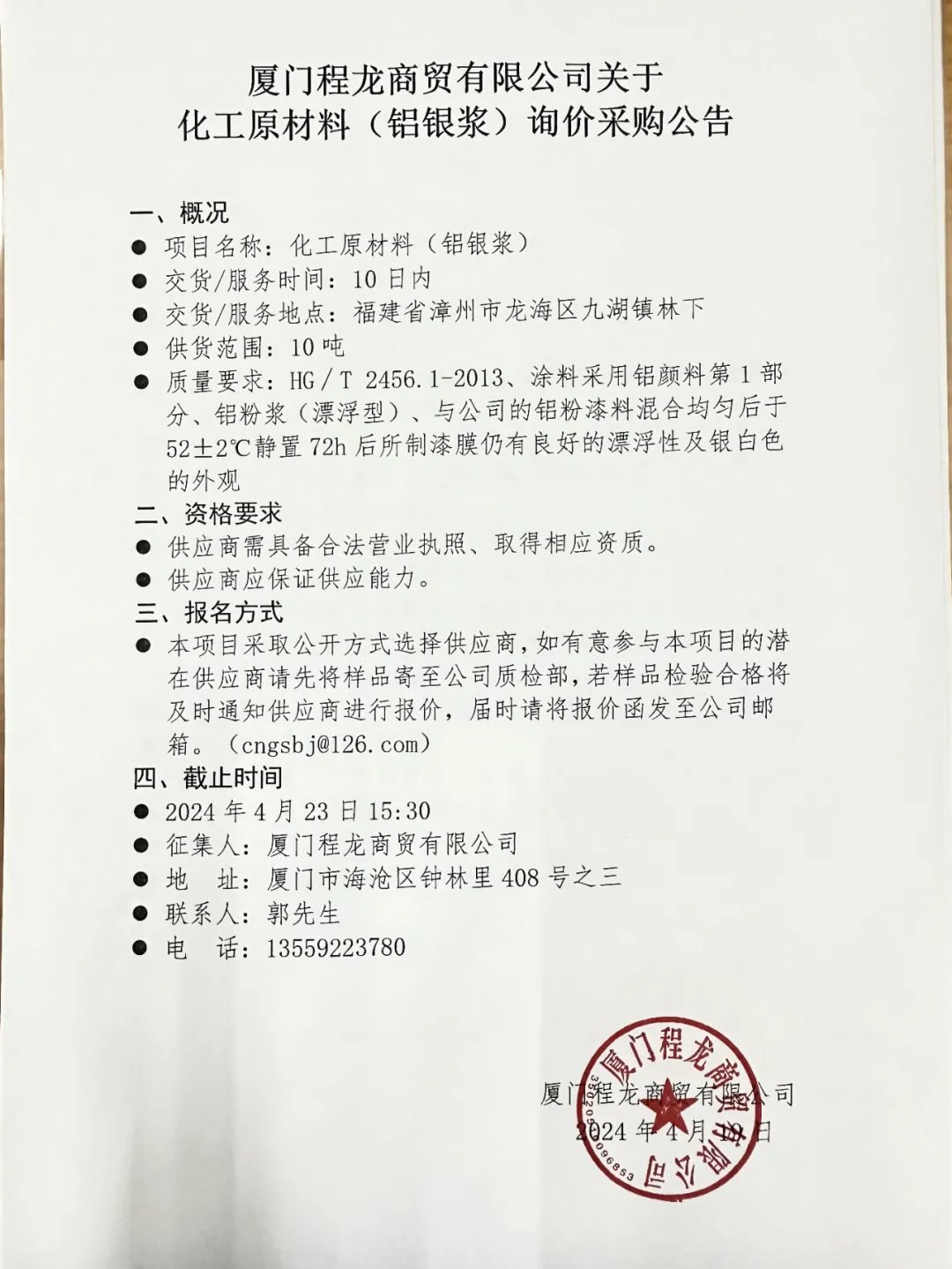 ●本项目采取公开方式选择供应商,如有意参与本项目的潜在供应商请先将样品寄至公司质检部,若样品检验合格将及时通知供应商进行报价,届时请将报价函发至公司邮箱。(cngsbj@126.com)