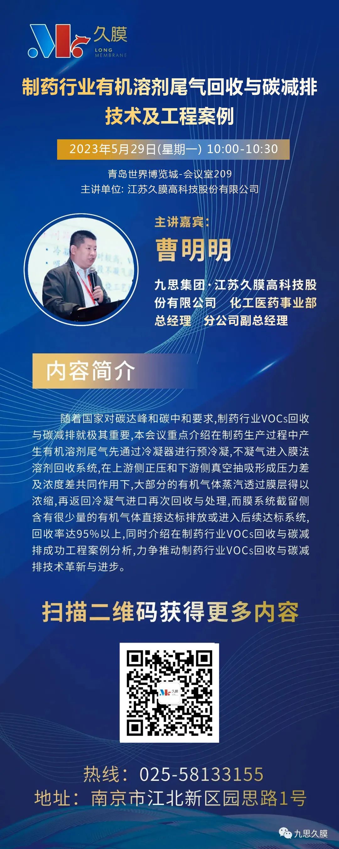 第62届(春季)全国制药机械博览会CIPM将于2023年5月28日-30日在青岛世界博览城举办。本届博览会的主题为“创新技术、智能制造,引领全球制药机械发展”。九思集团·江苏久膜高科技股份有限公司、山东产研久膜科技开发有限公司将将携最新的产品、技术、解决方案和创新理念,与行业同仁们再度相聚青岛,展示、交流、碰撞,共同见证药机行业旗舰展会带来的新体验、新高点!现场用科技诠释:VOCs高效回收与治理整体解决方案,欢迎行业相关人士莅临参观指导!公司面向全国医药企业的VOCs回收与治理、有机溶剂尾气回收、有机废水中溶剂回收以及减碳减排等重大需求,参展产品包括:VOCs回收与治理成套设备、VOCs回收膜、溶剂回收膜等,此外公司受邀展会同期技术交流,期待与您相会。谨此,我们真诚邀请您拨冗莅临展台和参加技术交流,品鉴精彩不见不散!青岛世界博览城(黄岛区三沙路3399号)