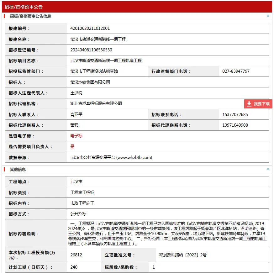 近日,从武汉公共资源交易平台获悉。武汉市轨道交通新港线一期工程轨道工程启动招标。本工程招标范围为武汉市轨道交通新港线一期工程的轨道工程施工(不含车辆段内轨道工程施工)。计划工期240天。