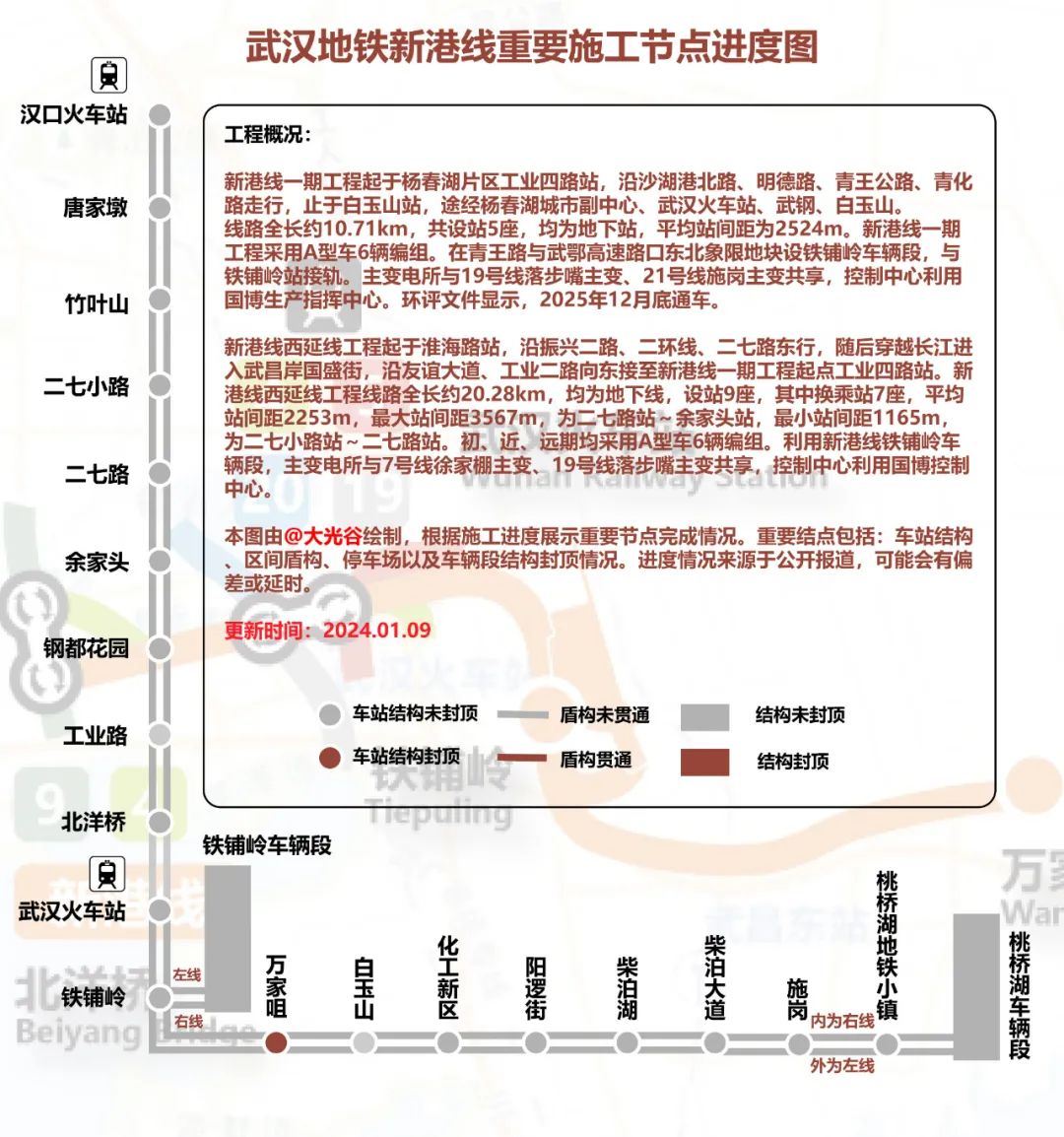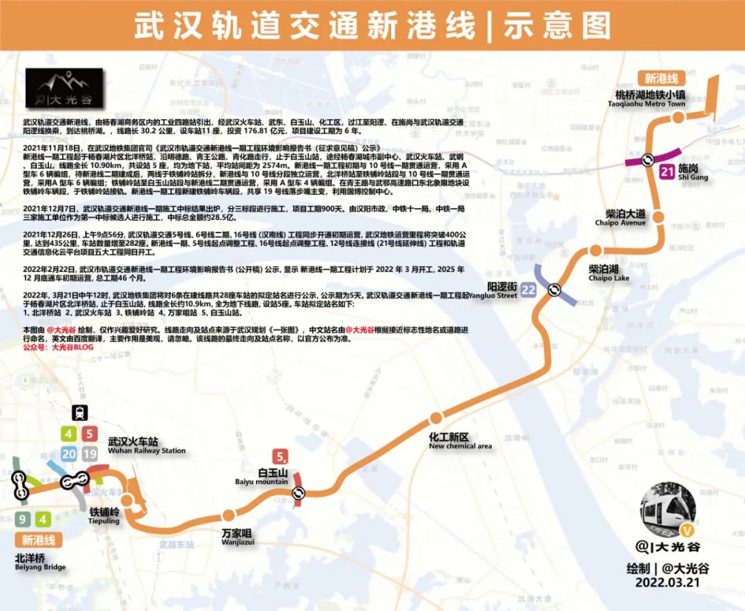 武汉市轨道交通新港线一期工程已纳入国家批准的《武汉市城市轨道交通第四期建设规划( 2019-2024年)》,是武汉市轨道交通线网规划中的一条市域快线,该工程线路起于杨春湖片区北洋桥站,沿明德路、青王公路、青化路走行,止于白玉山站。线路全长10.90km,共设站5座,均为地下站。新建铁铺岭车辆段,共享19号线落步嘴主变,利用国博控制中心。