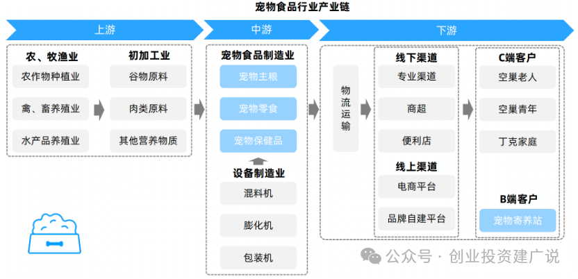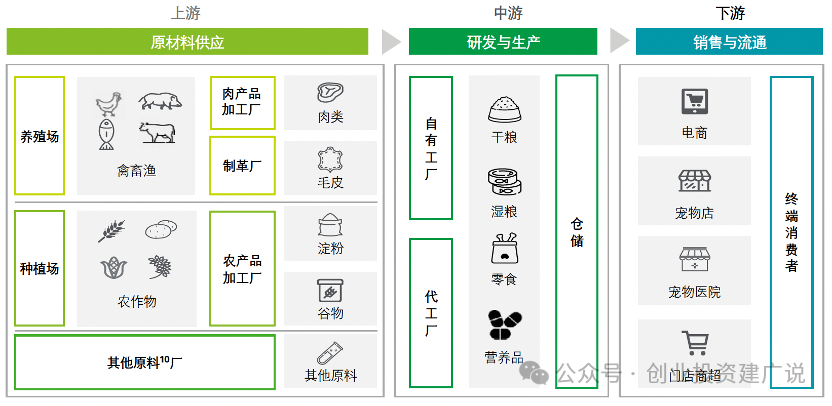 宠物食品上游受农副产品价格波动影响较大,中游生产品牌代工互相延伸布局,下游消费者旅程呈现全渠道融合趋势。