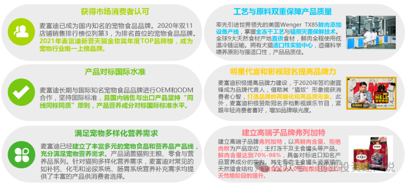 麦富迪凭借在宠物食品业务方面丰富的专业知识,提出独特的品牌价值主张「有猫有狗就有麦富迪」。