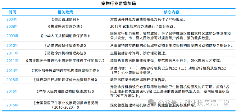 宠物行业作为新兴行业,发展初期行业不规范、监管不到位,部分门店无证经营、环保设备缺失、医生无证上岗、价格不透明等问题频发。近年来国家出台了一系列的法律法规以及开展了多次清理整顿工作来加强监管和规范,促进行业有序、健康发展。宠物诊疗机构有牌照准入制度,通过环评,并且要求有3名以上注册的执业兽医。