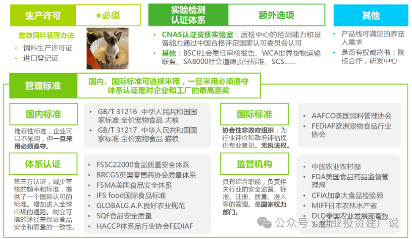 宠物食品安全质量保障:消费者对宠物食品的质量、安全、营养要求高也意味着对企业的制作工艺要求严格,国内宠物食品电商以及零售品牌必须在提高自主研发能力的同时,提高食品生产的技术、安全、卫生以及环保标准。宠物食品没有统一的行业标准。中国宠物用品行业起步较晚,虽然国内宠物用品市场发展迅速,但是对应的行业协会发展相对滞后,宠物食品仍然作为饲料在进行管理,也没有制定宠物用品生产的相关行业标准,由于缺乏统一的规范,导致很多厂家的产品在质量及性能上差异较大,影响了整个行业总体的健康发展。