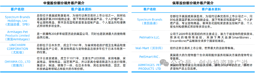 国外市场:中宠股份(OEM/ODM)和佩蒂股份(ODM)均采取贴牌的方式,向国外知名的品牌商、综合性或专业性的商超、宠物产品连锁店等供货,自主品牌产品销售占比较小。从国外市场营业收入及同比增速来看,自2015年以来,受益于国外宠物市场的稳步增长以及新客户的拓展,中宠股份、佩蒂股份国外营业收入分别保持15%、8%以上的增速,中宠股份处于领先地位;从国外市场毛利率来看,佩蒂股份明显高于中宠股份,从国外市场客户和销售区域来看,中宠股份和佩蒂股份存在一定的相似性:两者的主要客户包括美国品谱和英国Armitages,产品主要销往北美和欧洲等发达国家。