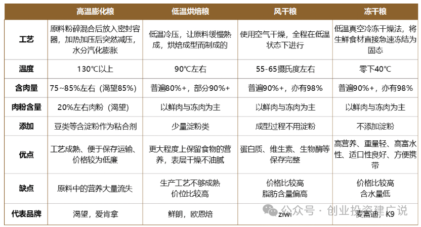 主粮工艺持续升级,呈现烘焙、风干、冻干多元路径。宠物干粮按工艺可以分为膨化粮、烘焙粮、风干粮和冻干粮,其中膨化粮工艺最为成熟、易于保存运输,系目前市场主导的主粮品类;而烘焙、风干、冻干作为升级工艺,利于原料营养保存、更贴近宠物原始饮食天性,存在适口性好、营养价值高等优点。随着宠物用户对更高品质的追求,目前冻干、风干等新型工艺产品成为消费热点。另外近年来市场亦出现了多种生产工艺产品线组合式创新,如冻干+膨化或风干+膨化的双拼粮等,亦凭借丰富口感获得消费者认可。