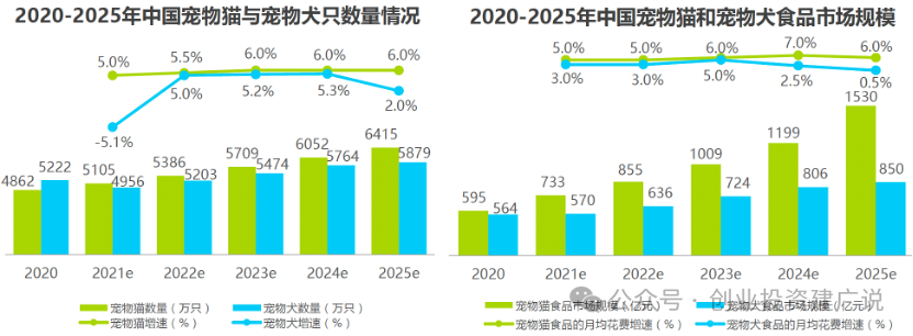 因各地养犬政策调整及疫情限制居民活动等客观因素影响,导致宠物犬数量预计于2021年下滑并出现负增长。在预测期间宠物犬数量增速呈现收缩态势。宠物猫因饲养难度低,获接受程度更高,数量将不断增加。预计未来宠物猫数量增速将维持在5%-6%区间,2025年宠物猫的数量将达到约6,415万只。