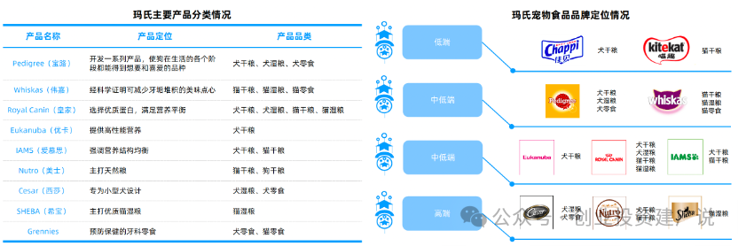 在从事宠物市场的80余年来,玛氏打造了几乎涵盖所有宠物所需食品的多元产品线,既有前期自己创立的Kitekat、Pal、Chum等低端层次品牌,也有后来不断收购的KalKanFoods、皇家宠物食品公司、Nutro(美士)天然宠物食品公司等中端及高端层次宠物食品品牌。