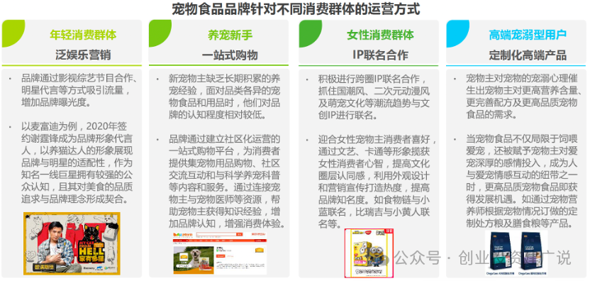 宠物食品消费者可划分出不同消费群体,各消费群体呈现鲜明的消费心理特点。品牌通过泛娱乐化营销手段吸引年轻消费群体的关注,通过影视剧合作和明星代言等方式吸引流量,扩大社会公众对品牌的认知度。对新成为宠物主的养宠新手,品牌通过建立社区化运营的一站式购物平台,提供购物、交流和科普的平台,增强消费体验和粘性。对女性宠物主,品牌通过IP联名合作打造热度,迎合喜好并获得认同。对宠物更加宠溺的高端用户,则推出定制化的高端产品满足需求。