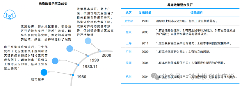 以养狗政策为例,从上世纪80年代到至今,养狗政策逐渐放开,由最初的禁养到规范饲养。期间养狗政策经历了三次转变: