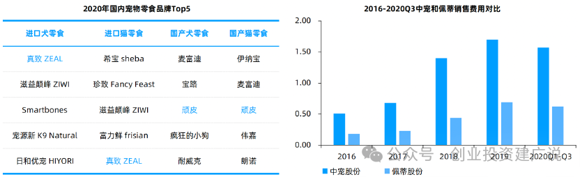 品牌对比:中宠和佩蒂在国内市场均实行多品牌策略,均具有“中低端品牌”和“高端品牌”。从品牌影响力来看,中宠股份的“Wanpy顽皮”和“Zeal真挚”品牌影响力较高。据宠物行业白皮书统计数据显示,“Zeal真挚”分别位居进口犬零食、猫零食品牌排名的第1名、第5名;“Wanpy顽皮”在位国产犬零食、猫零食品牌排名中均位于第3名。从品牌推广来看,中宠股份更加注重品牌宣传。2020Q1-Q3,中宠股份的销售费用为1.57亿元,佩蒂股份的销售费用仅为0.62亿元。