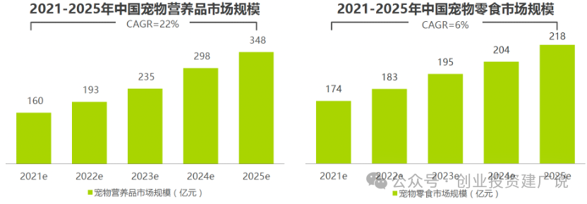 随着科学养宠概念在宠物主消费群体中广泛传播,越来越多的宠物主对养宠生活中的宠物营养问题加深了解,宠物主逐渐认识和接受宠物营养品概念。中国宠物饲喂环境特点致使宠物具有营养补充需求,而营养品可满足宠物日常营养补充并进行疾病预防,填补了国内原有市场在营养补充方面的空白。预计2021至2025年宠物营养品市场复合增长率将达到22%,高于宠物食品市场同期16%的增速。宠物营养品具有日常化消费的特点,预计其渗透率将得到不断提升,2025年宠物营养品市场规模将达到348亿元。