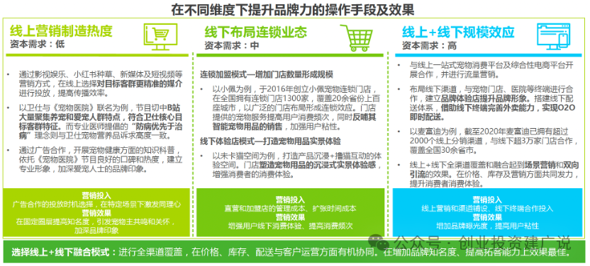 宠物食品品牌通过在线上和线下不同维度进行营销投放与战略布局,从多个角度达到提高品牌力的效果: